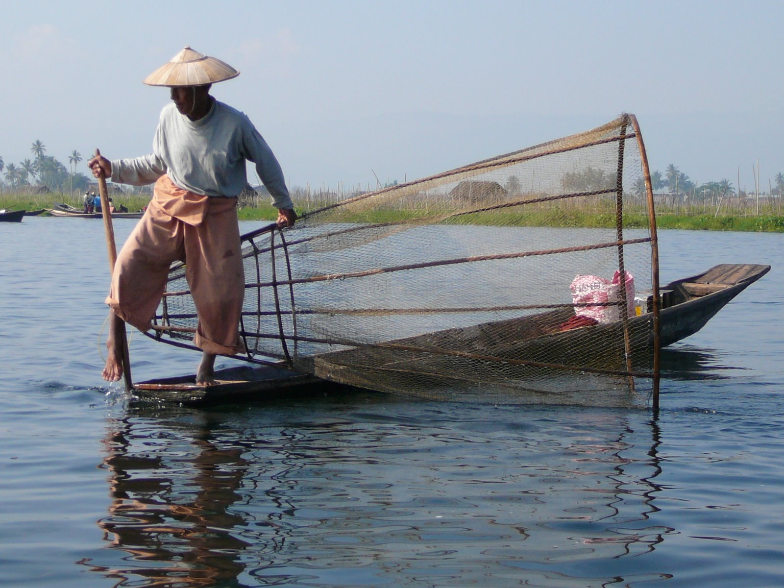 These are the famous fishermen of Inle Lake and it is fascinating to watch them. Many of them are friendly and come along side our boat so that we can take pictures and exchange smiles of greeting.