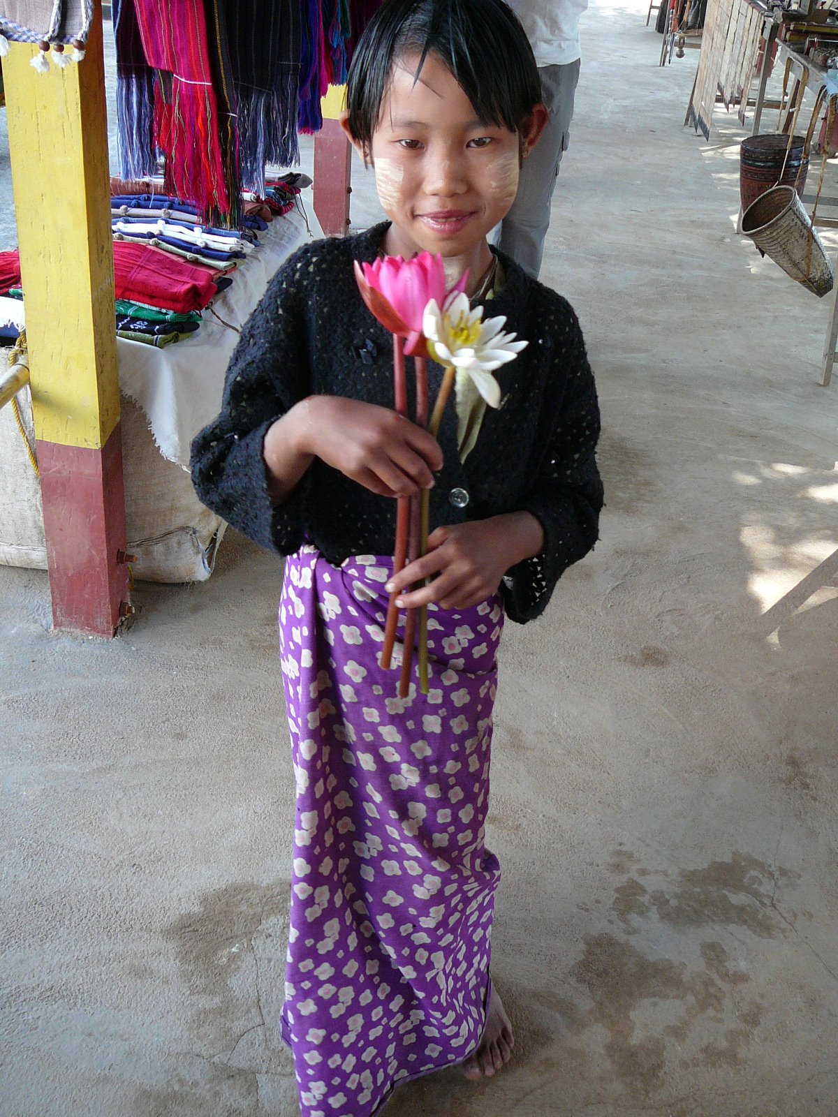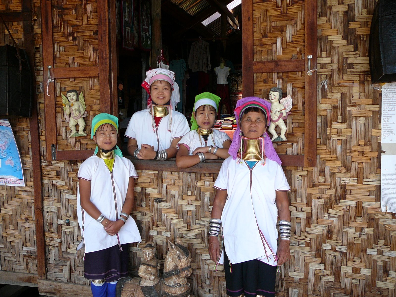 The women wear gold coloured metal coils around their necks and calves. It gives the women very long necks, but apparently doesn’t actually stretch the neck, rather it pushes down the collar bone. They can take the coils off, but have to be extremely careful for three weeks until their collar bone recovers its original position. The origin of this is to protect from tigers, which always attack either the legs or the neck. There are only a handful of these women left, not because all the others have been killed by tigers, but because the majority of the tribe crossed the border to Thailand where they can make much more money from the tourist industry.