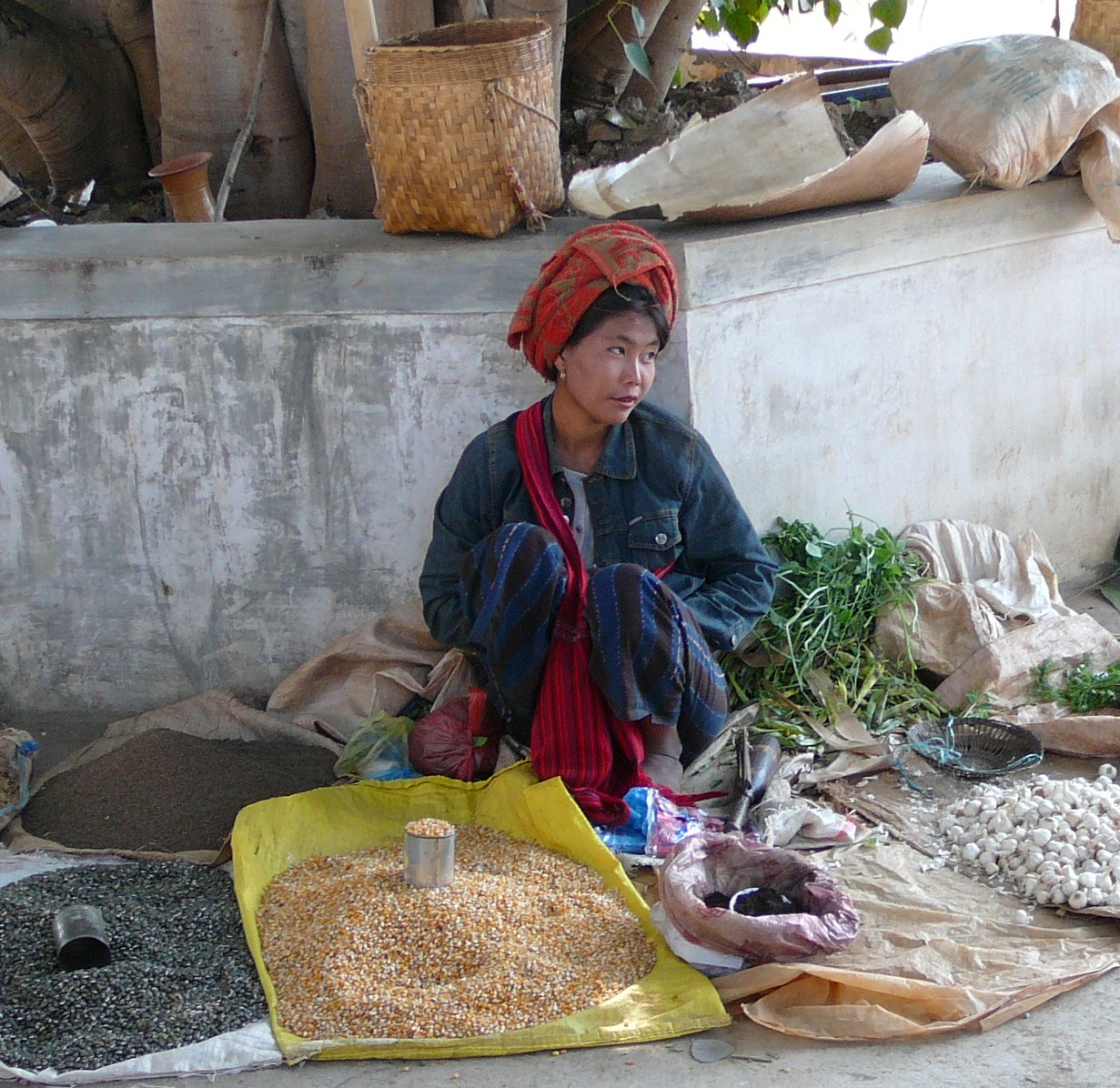 We pay our first visit to a village where we meet the Pao tribe. The women wear all black with a colourful headdress, which actually looks like a small blanket folded neatly on top of their head, which must come in handy as it gets quite cold at night. You can tell which village they come from by the colour of this blanket. We go to see one of their markets, which is a desultory affair, with desperately poor looking women trying to sell tiny amounts of vegetables or spices.