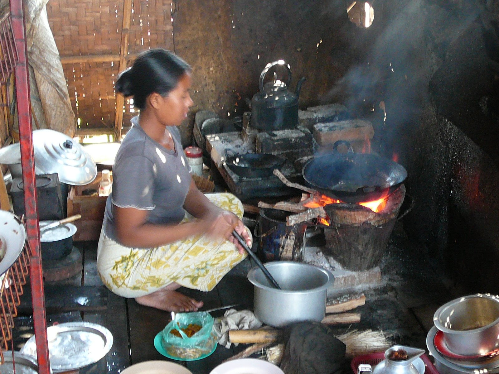 The house fills up rapidly with people, some family, some neighbours, all come to meet the foreigners. There is an eighty year old woman who lives next door, and several toddlers. They all sit in a big circle round us on the floor. Tea is made and offered. They are all charming and entertaining and interested in us, with a lively sense of humour. They want to know where our families are, and when we say we do not have families, they invite us to join theirs. Now, as I am sure you appreciate, there is absolutely no way on God’s Earth that this is going to happen, but I manage a gracious smile, and say that I would love to, as long as they didn’t expect me to row with one leg. There is much laughter. After a while one of the daughters disappears into the kitchen and returns some time later with the most delicious potato crisps we ever tasted. She has just made them over the open fire in their tiny kitchen. Considering the place is made of wood and reeds, the open fire seems a little dangerous and we ask if their houses ever catch fire. This is cause for a lot more laughter, even though the answer is yes.