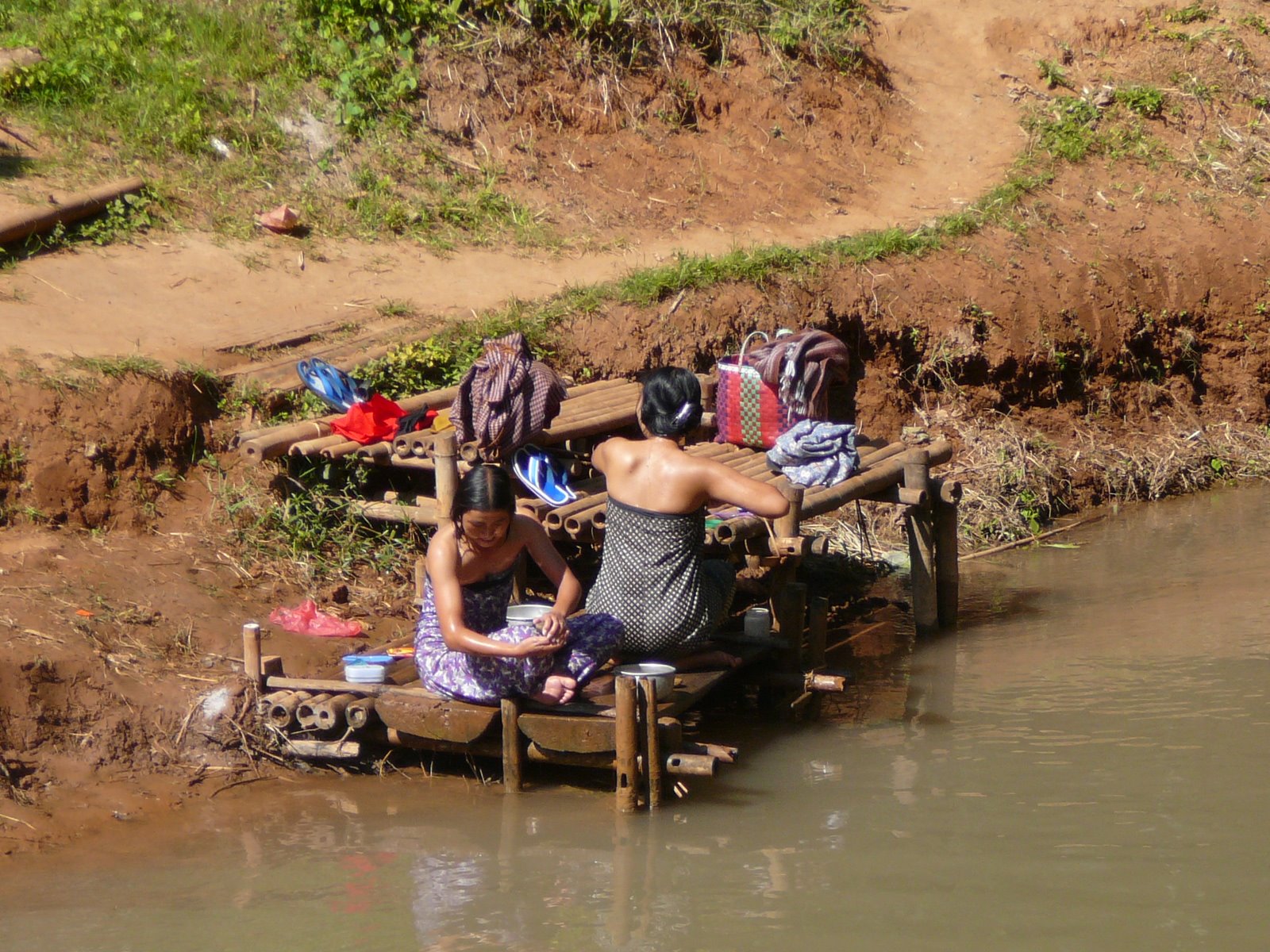 People washing themselves and their clothes in the lakes and rivers is a common sight in Myanmar, but this is the first time we have seen it elevated to performance art.