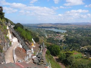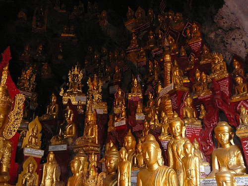After much political discussion, and a three hour journey, through beautiful countryside, we finally reach the caves of Pindaya. The caves are half way up a hillside and there are 8,090 Buddhas inside them.