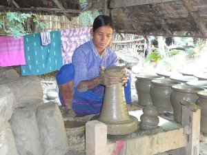 The rest of the village is busy making the pots for which they are famous. We watch as one woman throws pots on a turntable operated by another woman pedaling a belt to operate it. Amazingly, this one woman can make 60 pots a day. We each have a turn at doing the pedaling, and it is so hard that none of us last more than a few minutes. This woman does it from dusk to dawn.