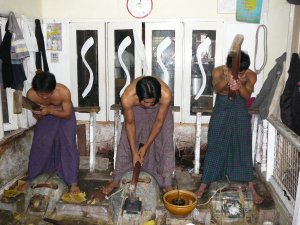 We visit several craft houses, all of them working without lighting. We watch as women stoop over their embroidery doing the most intricate work in semi darkness. Three men noisily beat gold into gold leaf. They will be deaf by the end of their worklife.