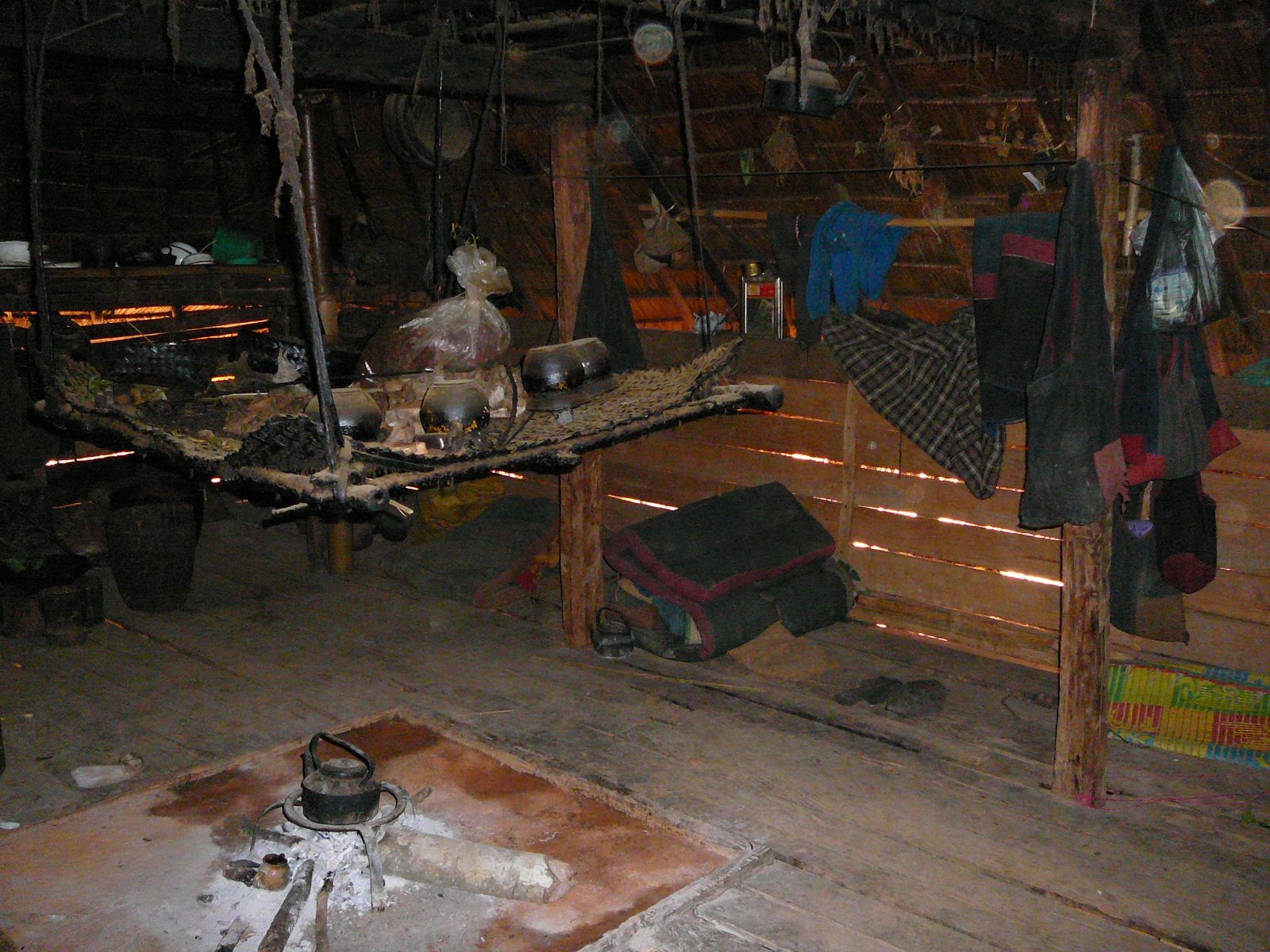 The people of Banglu have very little food, other than rice and a few vegetables. They catch whatever they can in the surrounding jungle, which is usually limited to the occasional rat. They skin the rats and leave them hanging in their homes to dry. Two or three rats will feed the entire village when added to a thin vegetable soup with rice and chilies. We visit a home where there is a collection of small animal skulls and skeletons hanging from the ceiling, the purpose of which is not made clear. A small fire is burning in the middle of the floor and a cooking pot with soup simmers on top.
