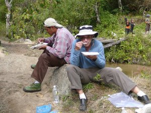 We leave the village with the children waving goodbye and running after us. The people have been wonderfully warm and friendly, but our flesh is crawling and we want nothing more than hot water and soap. Unfortunately neither is available. We do come to a stream, where we stop and wash our hands. We have brought with us a picnic of fried rice which we sit and eat by the stream. We discover a group sharing their lunch nearby.