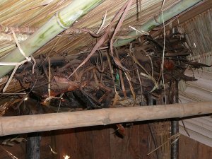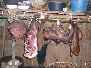 He comes over and shakes our hand and thanks us for bringing the medicine. He invites us to see his home, which, besides having the usual dead rats hanging from the ceiling, also has a haunch of a pig hanging from the wall.