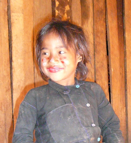 Again we distribute cookies and medicine. We meet two young girls with red paint all over their face. It turns out these girls had been fascinated by the red lips of a previous tourist, and she had kindly given the girls her lipstick. They had not had an occasion to wear it since, as there had been no visitors for months. But now we had arrived, they thought it appropriate to put it on. One of the girls had obviously forgotten that it was supposed to go on the lips, and had instead made red dots all over her face. The older girl had remembered where it was to go, but her skills of application were limited. She had a huge red gash from ear to ear. However both young women thought they looked beautiful, and as men have learned all over the world, it is always wise to offer no opposition to these feelings that women have.