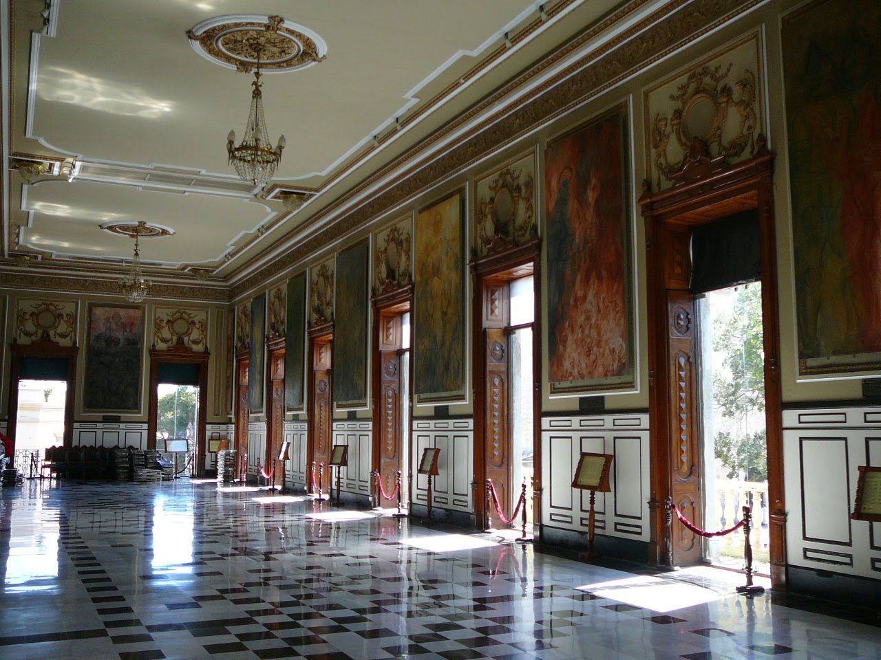 There is a stunning room that runs the entire length of the upper floor, facing the square. The room is at least 25 feet tall, with amazing hanging chandeliers and a black and white tiled marble floor. Huge double shuttered windows run the entire length. Between each window is a painting matching the size of the windows. There are a few sofas against the inside wall, otherwise the room is empty. It is also empty of people and we soak up the atmosphere, enjoying the paintings and the wonderful views of the square and the cathedral through the open windows.