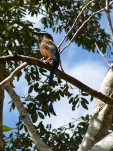 We finally get to see the Motmot bird, a rare, beautiful and unusual bird. It is of average size, looking a little like a kingfisher (it belongs to the kingfisher family) with striking blue and green colouring. But what makes it famous, is its tail. It has two extremely long tail feathers, which are in fact long bare shafts with a small shimmering blue fan on the end. When it sits in a tree, the two tail feathers hang down below the branch and the bird often wags them from side to side like a pendulum. But having such a fabulous tail has inadvertently led to the bird being endangered, as the two feathers are much prized for making Mayan headdresses
