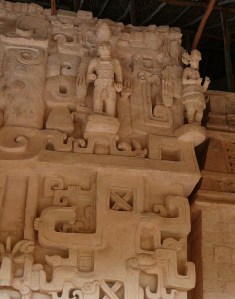 But here we can, and the view is breathtaking. We even have birds of prey circling below us. What adds to the importance of this building is that there are some unusual and well preserved carvings along with a small amount of original wall paintings. Some of the carvings are unique, depicting Mayans with wings making them look like angels. While restoration was taking place they found these carvings and paintings actually hidden underneath an exterior staircase. They had obviously been built over at one point and so they are perfectly preserved and in fact looking at them today they seem new. Even the painting is still brightly coloured.