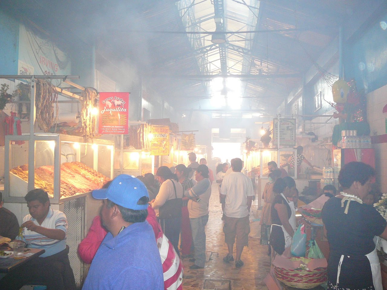 There is even a street selling nothing but ladies underwear in every style I can imagine, plus a few styles I haven’t imagined, for which I am forever grateful. Then there is the Mexican fast food hall, full of stalls each one barbecuing thinly cut meat. The hall is enclosed and the barbecue smoke just sits in the building. The smoke is so thick it is hard to see more than a few yards, and breathing is very unpleasant, and yet it is packed with customers and vendors who spend their entire day in there. Our eyes begin to water within moments and we can’t wait to get out.