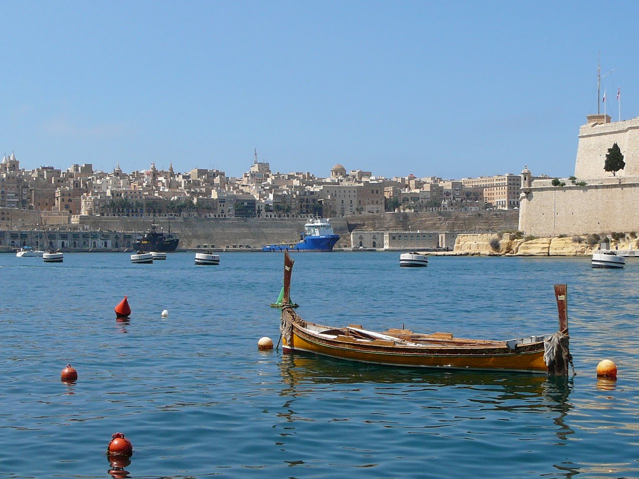 The protected water inside the inlet is covered with the small colourful fishing boats that are synonymous with Malta, as well as the little boats for carrying passengers that are reminiscent of Gondolas