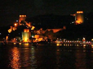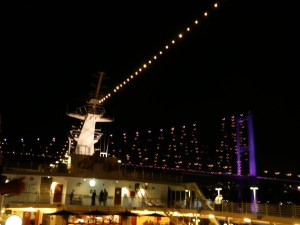 The entertainment crew lays on a big party on the open upper deck and we dance and listen to music for the next hour or so. The two bridges that cross the Bosphoros are both similar to the Golden Gate Bridge but are lit with hundreds of tiny coloured lights hanging like rain from the cables. There is a mass holding of breath as we narrowly squeeze under the first, our clearance seemingly only a couple of feet below the bridge.