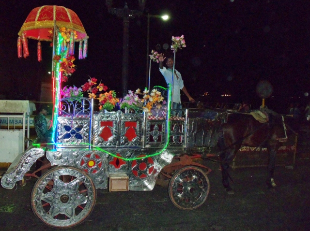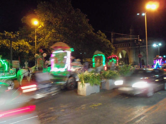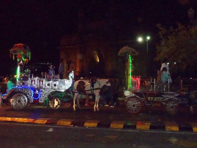 Outside the Taj Hotel there is a line of horse and carriages waiting to take tourists along the sea front.These carriages put the Central Park equivalent to shame. They have amazingly ornate tin panels on the sides and front and a canopy or huge umbrella over the top. Some are filled with vast vases of flowers, but all are magically lit with hundreds of tiny multicoloured bulbs that reflect in the tin.