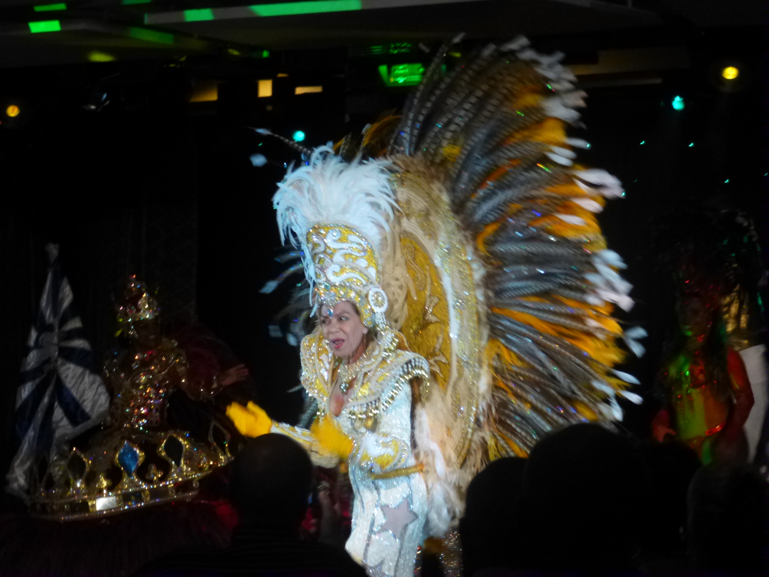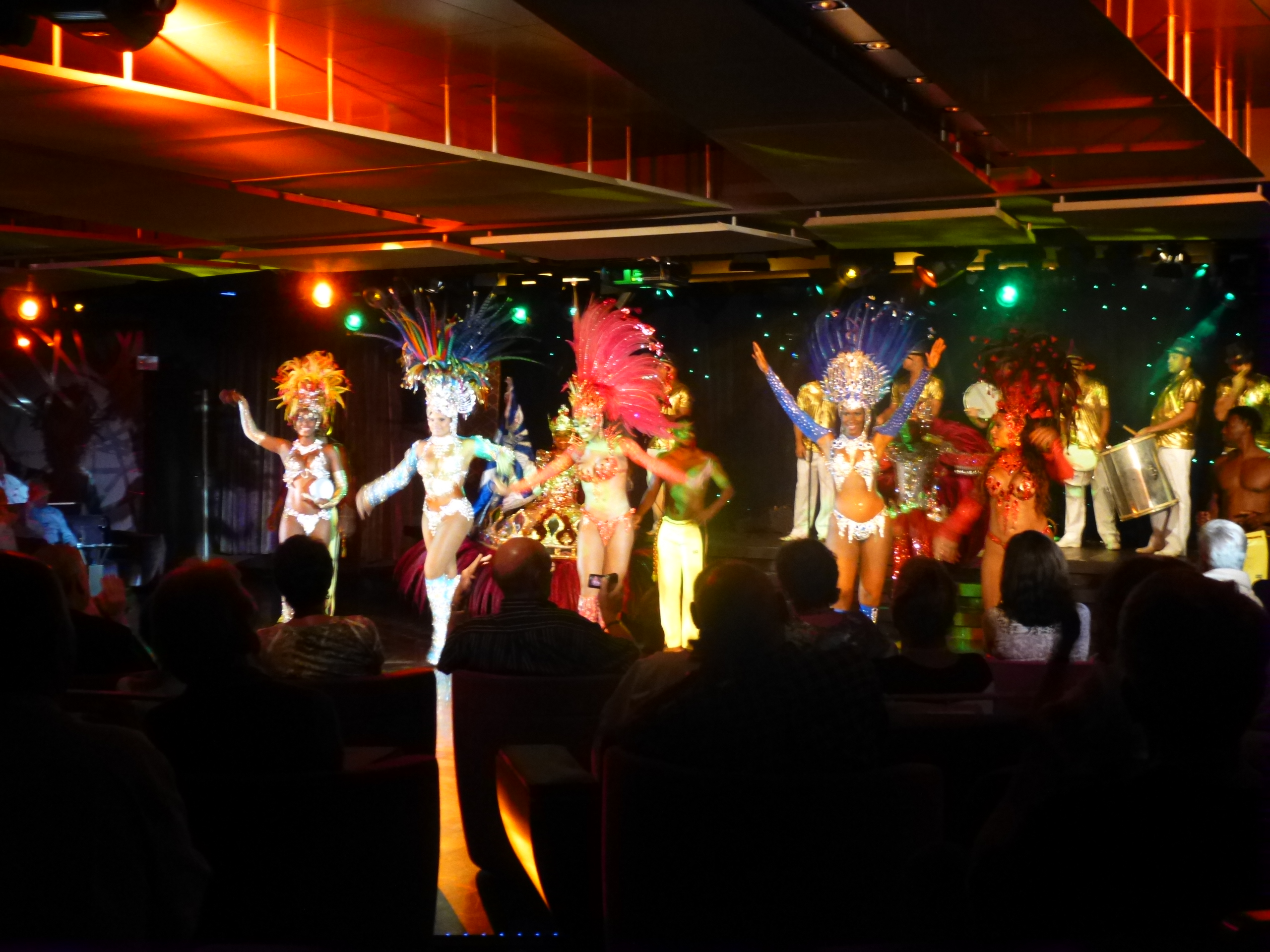 But to make sure we don’t lose the original excitement we feel for Rio, the ship has laid on a Samba show for our last evening, inviting on board a local dance group. We see the group arriving in their street clothes and they are a seedy looking group. If we had come across them on the quiet streets of Santa Teresa we would have fled. Most samba dancers are from the slums and this is an important way to make money. Once they are stripped of their street clothes and adorned with just glitter, feathers, gold and a patina of sweat they look terrific. Add a pulsating beat and they, just like the city they come from, put on a fabulous show.P1000411P1000388P1000403