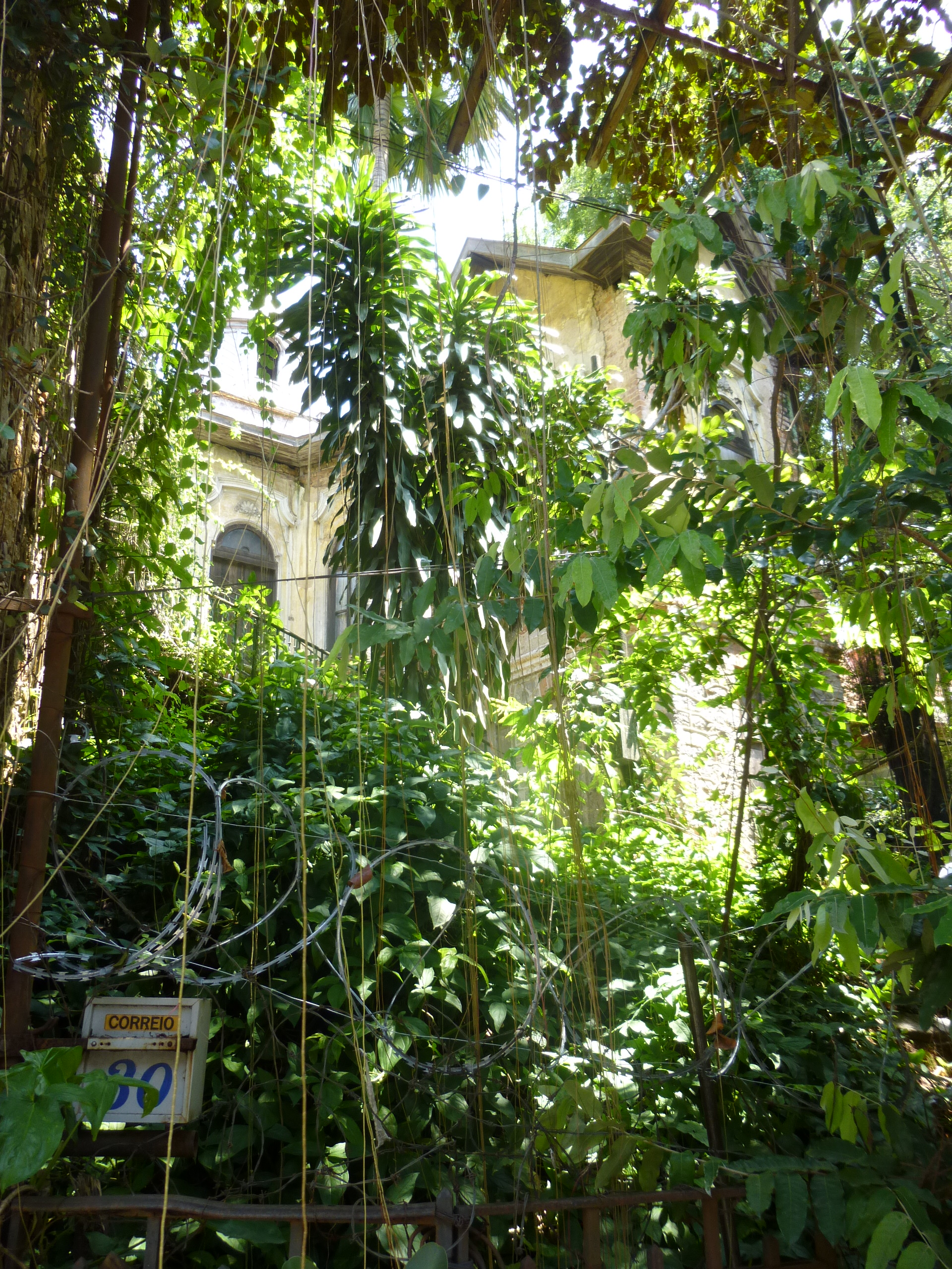 They lead us up to a neighborhood called Santa Teresa, where we quickly discover all the streets are deserted, which is a little worrying. It is one of the older neighborhoods and it is supposed to be quietly being discovered. But we are on the fringe and here any discovery that is going on is being done so quietly it is almost silent. There are steep cobbled streets which could be charming, but the first thing that needs doing is to reclaim them from the ever encroaching jungleP1000437There are large colonial houses, their past glory fading behind rolls of barbed wire and more jungle:P1000442