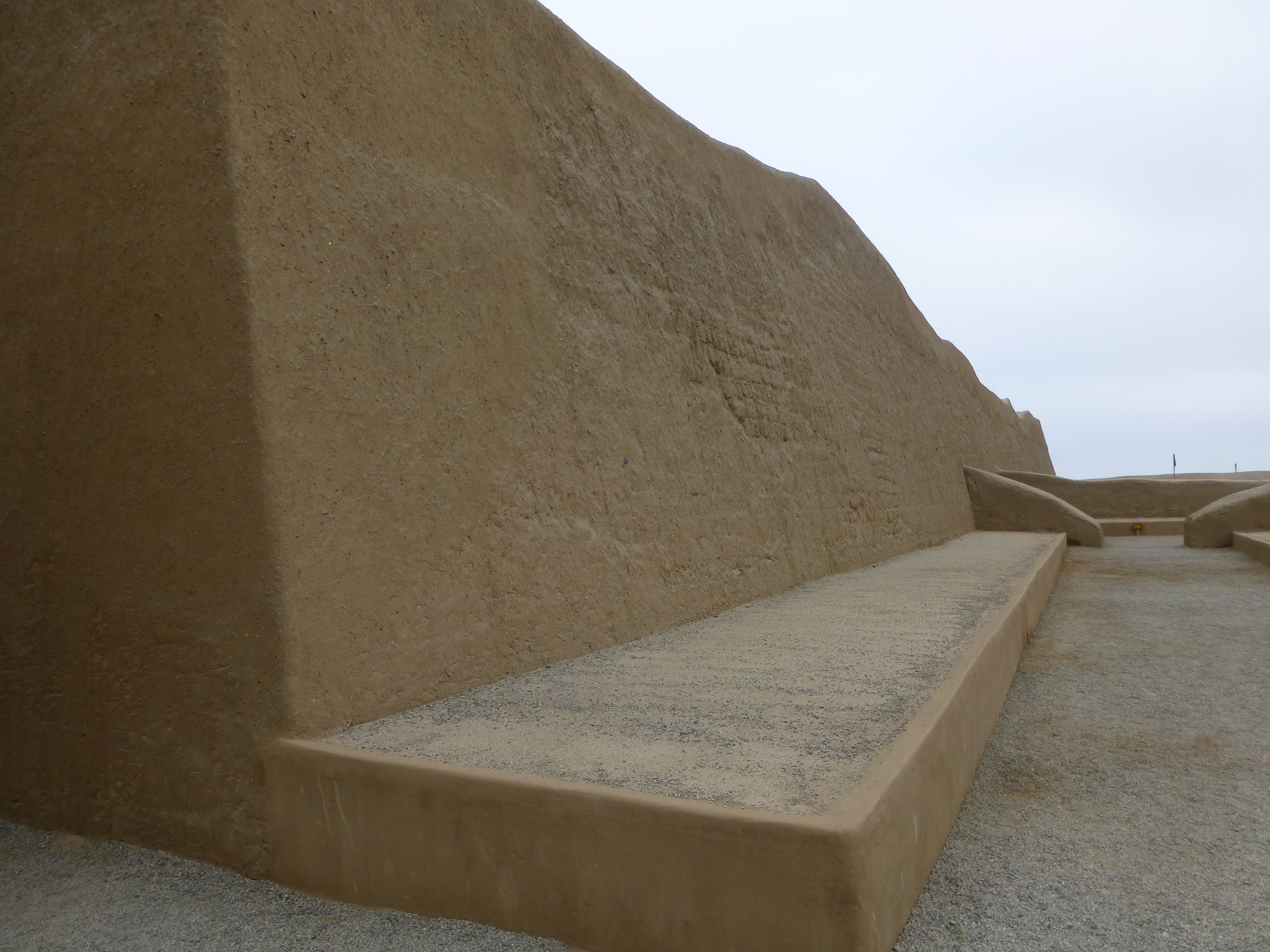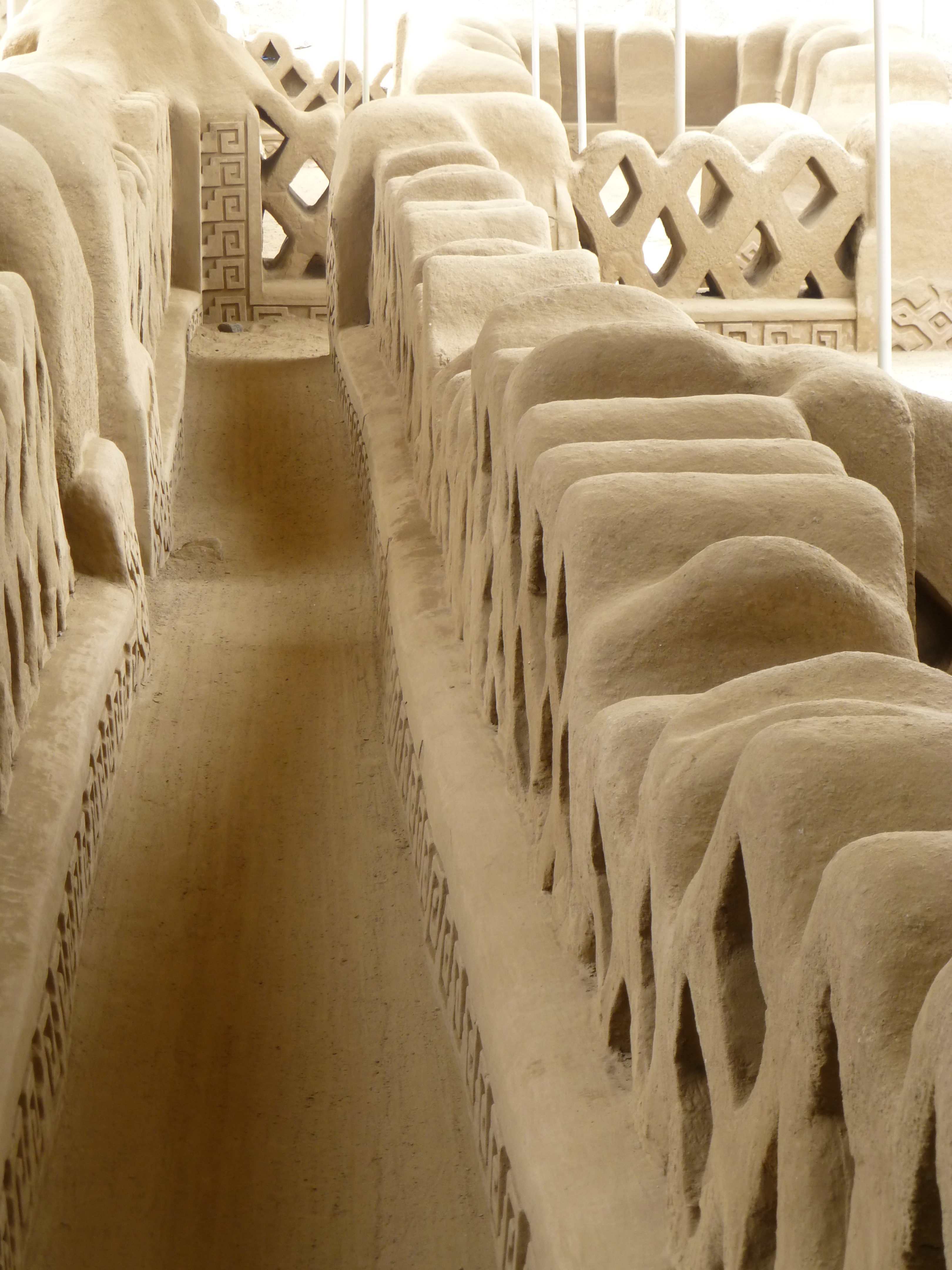 The ship’s first stop is Salaverry, a port for the town of Trujillo. We have rented a car and the four of us set out to see Chan Chan, one of Peru’s great historic sites which is virtually ignored by the majority of tourists who look no further than Machu Picchu when visiting this country. Chan Chan, thought by many to be a risque Chinese dance club, was in fact the Capital City of the Chimú civilization and was founded in 850. By the 15th century it had become the largest city in South America and the largest Adobe City anywhere in the world. It is built entirely of sand mixed with shells and tiny stones, and placed in the middle of a bleak coastal desert that received less than an inch of rain a year. Despite its location it survived and thrived due entirely to the incredible engineering methods used by the Chimú to irrigate their crops, techniques unknown in Europe and North America until the late 19th century.
