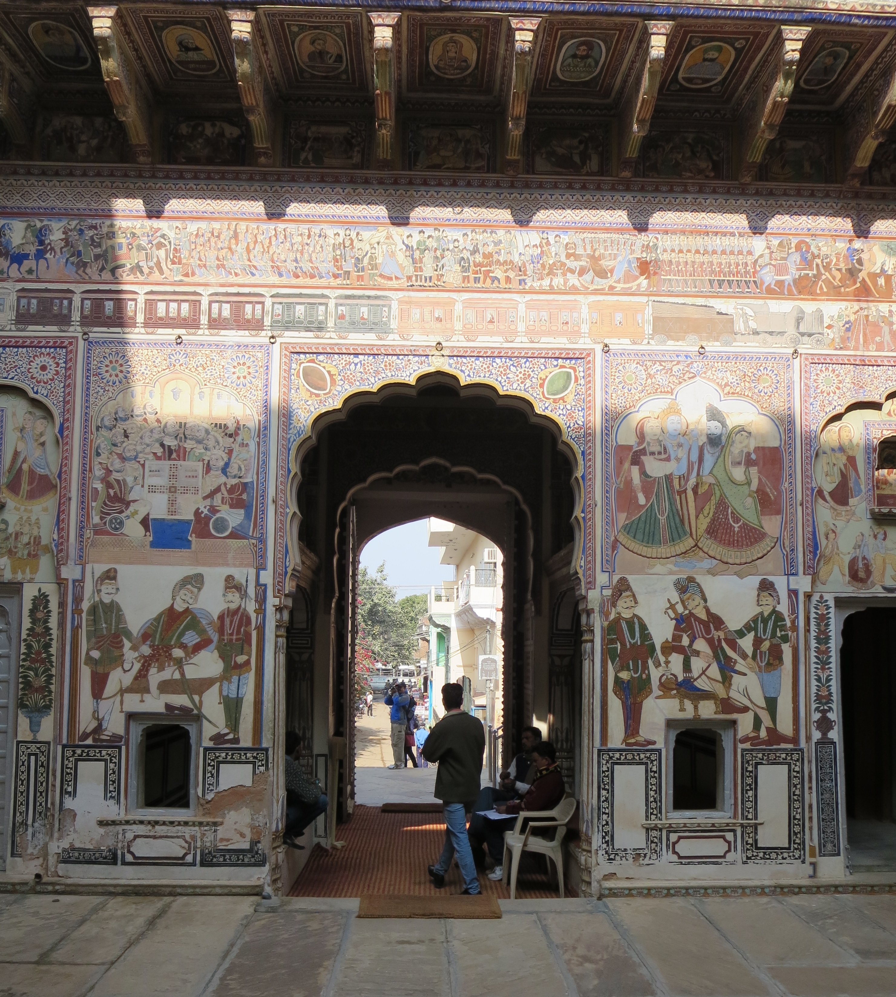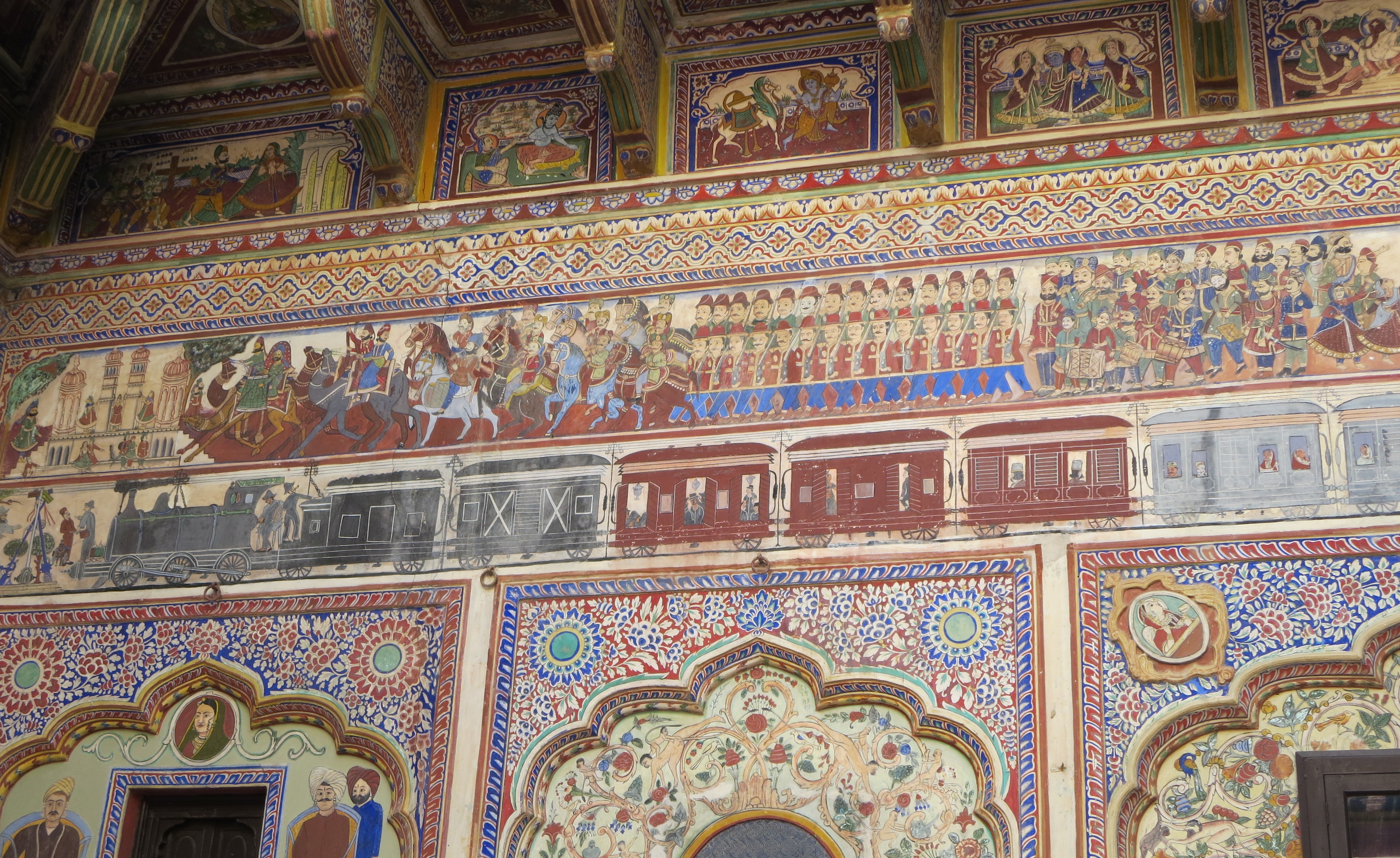 Havelis are the houses of merchants and the earliest ones date back to the 17th century when the silk road came through. Silk was being brought into the area and traded for spices. But most of the Haveli’s that remain are from the 19th and early 20th century. The local merchants helped on by the British Raj thrived , prospered, and in the way men all over the world do, they wanted to show off. So they built themselves grand new homes, and they adorned these homes with frescoes which depicted the local flora, important people and scenes from around the world.