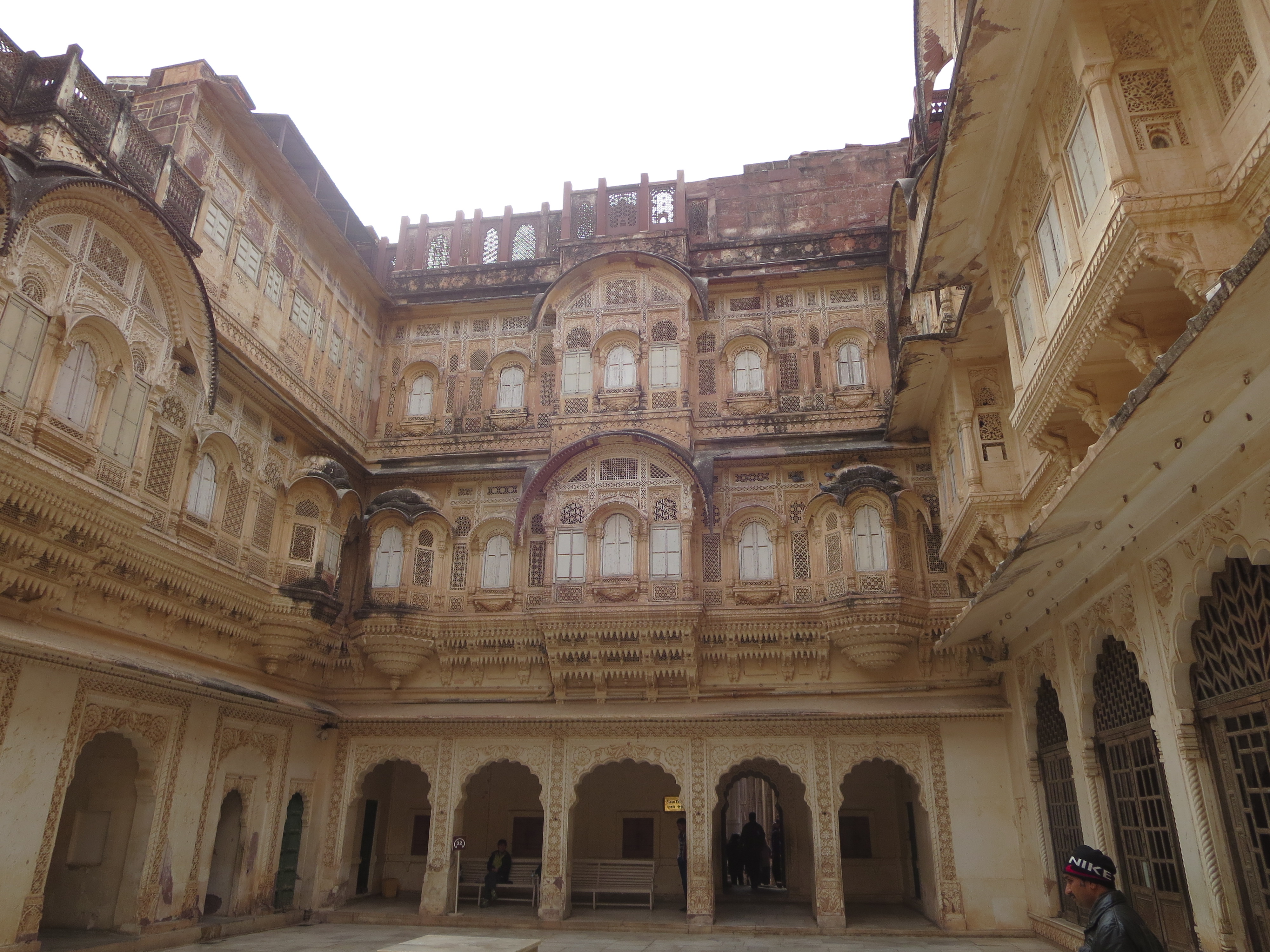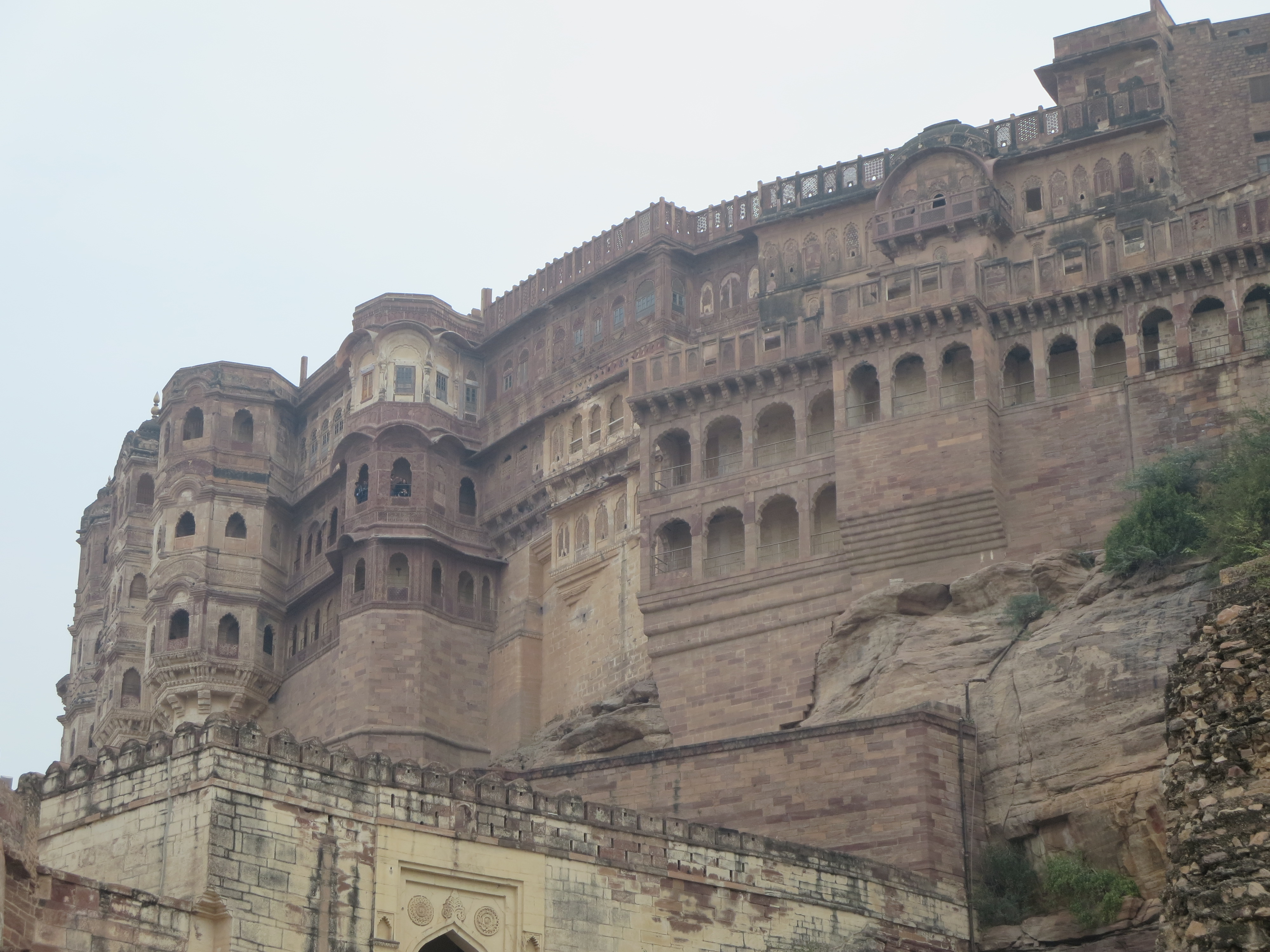 We are four hundred feet below the Mehrangarh fort, and although the usual mist or fog (we still haven’t determined which it is) is present, it does nothing to diminish the splendour of a 100 foot tall fort perched on top of a four hundred foot cliff. It dominates the skyline of Jodphur, its burnished red sandstone, imposing and beautiful, but impenetrable. Building started in the fifteen hundreds and it was four hundred years before any outsiders could penetrate its walls.