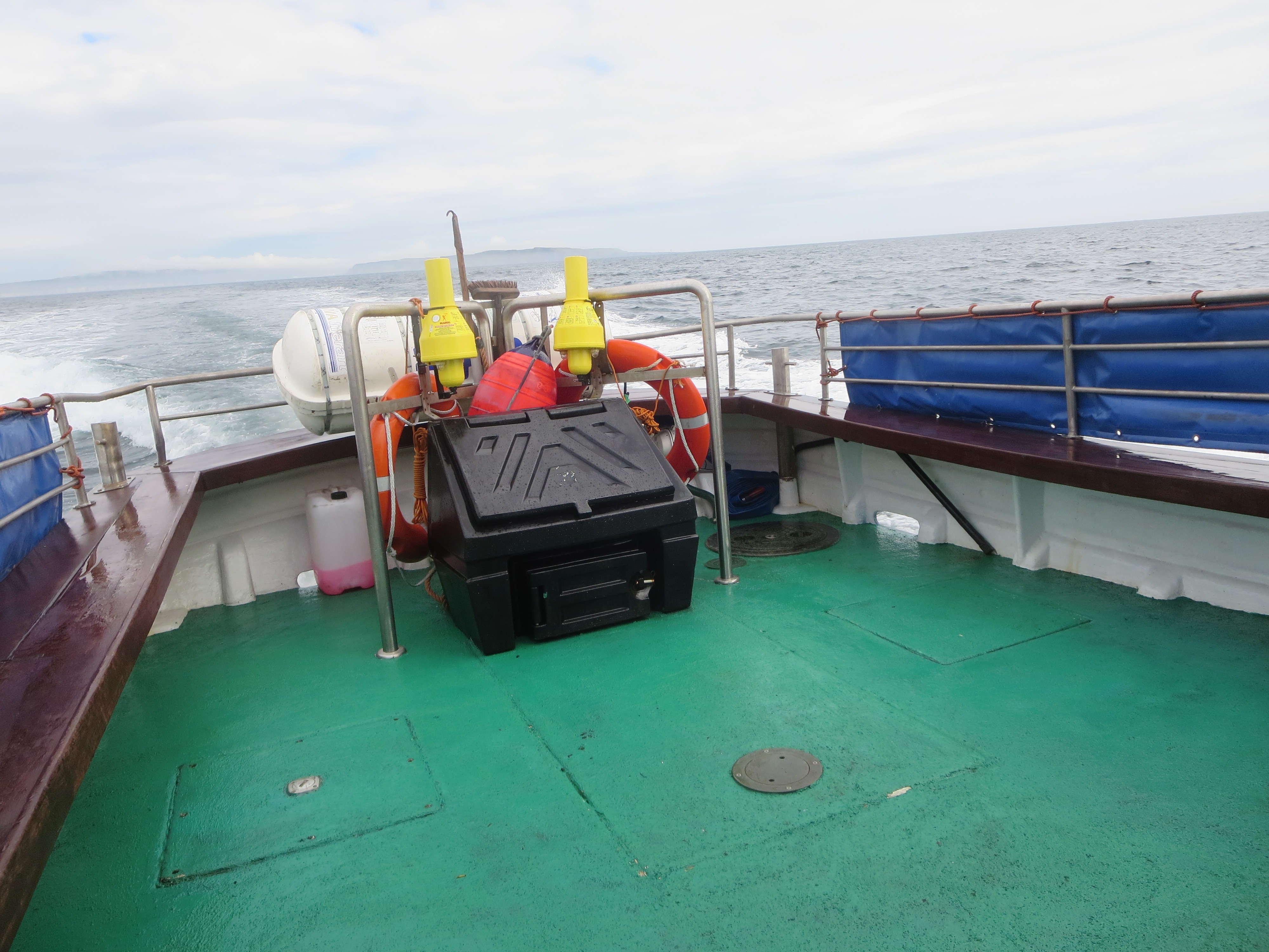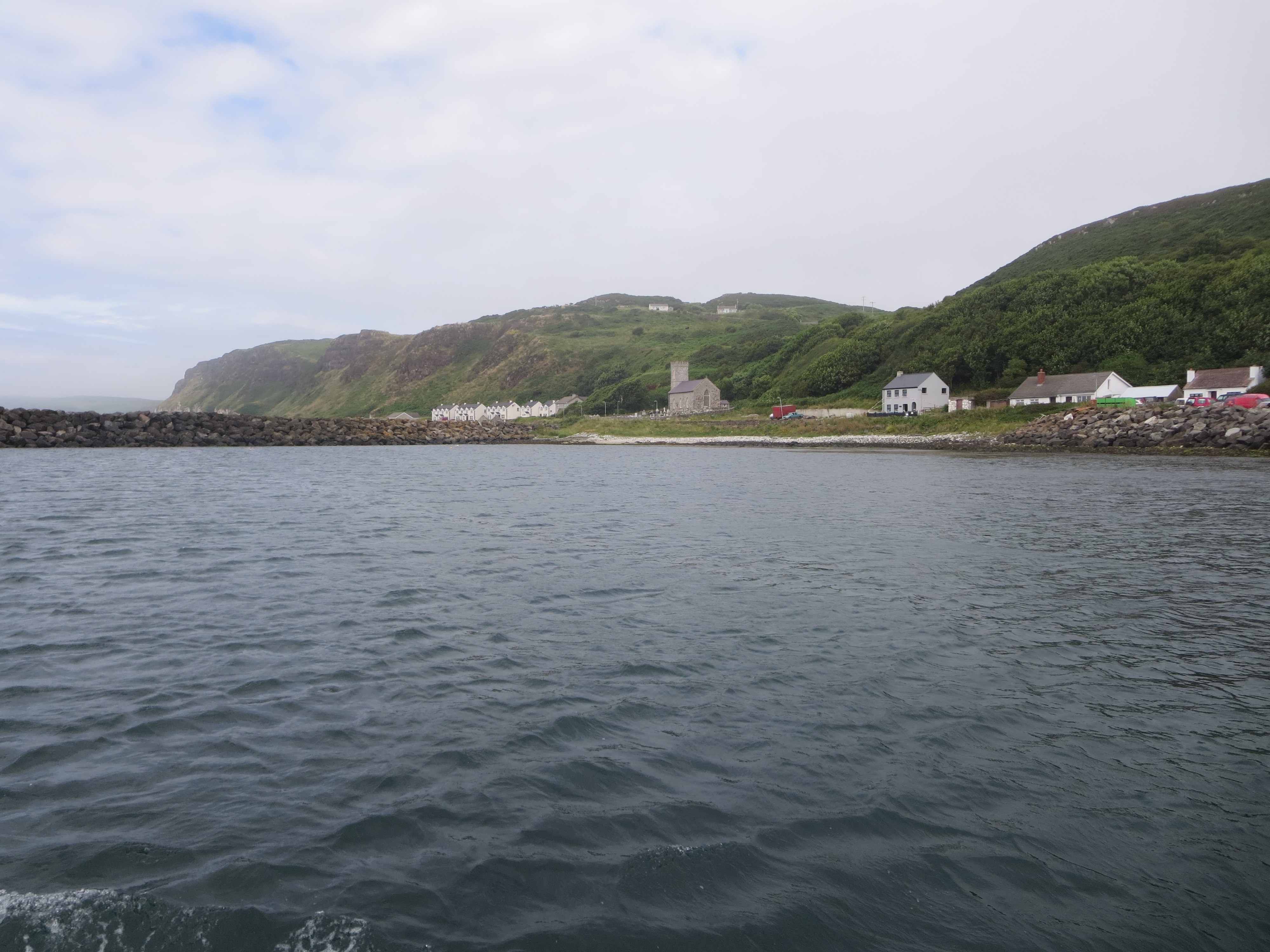 We are lucky that the day is clear and the sea fairly calm but even so no one wants to sit on the seats as the waves continually wash them with spray. Instead we all huddle in the sheltered bow. It takes twenty five minutes to get to the island. It is not a particularly welcoming sight