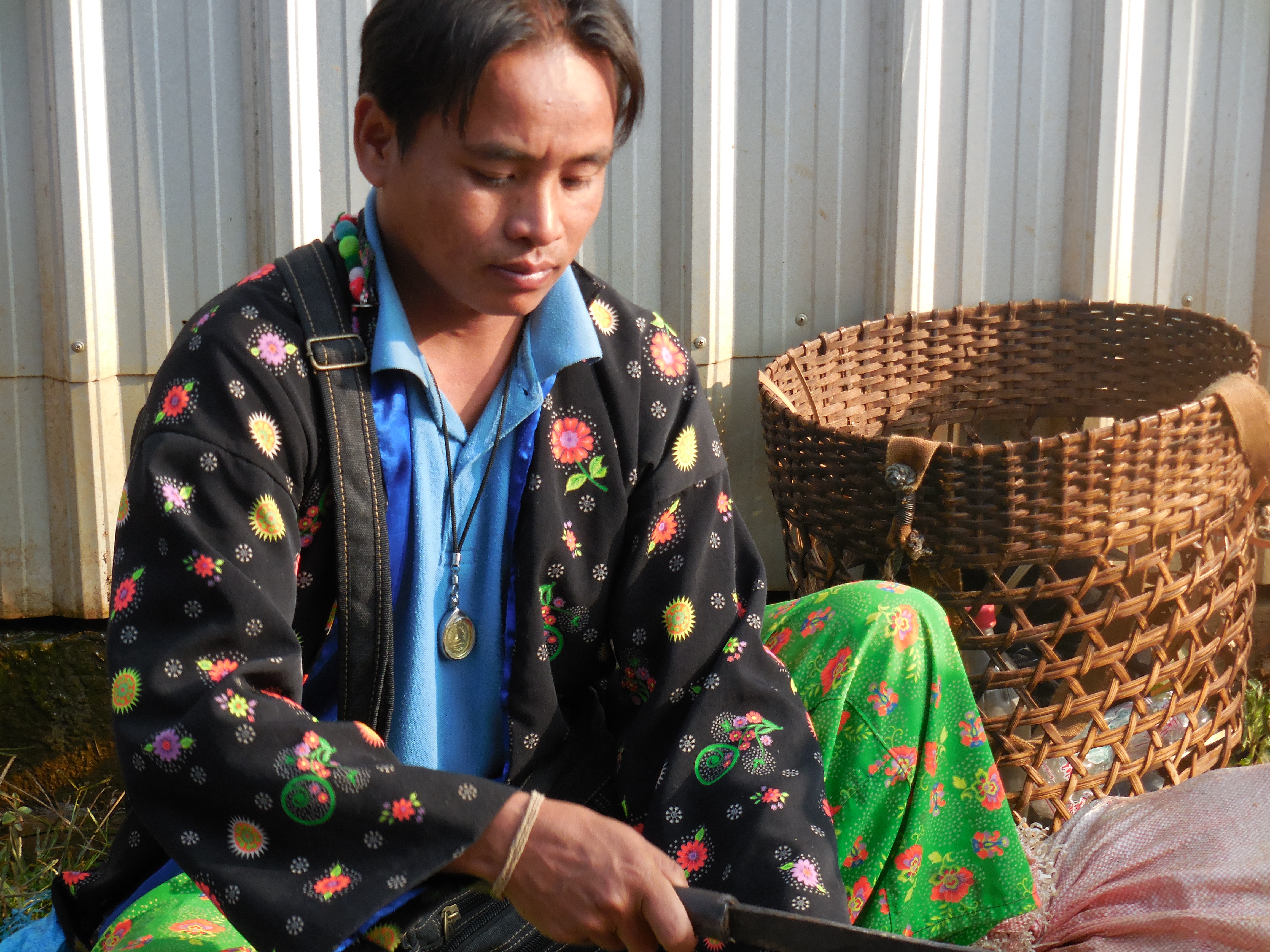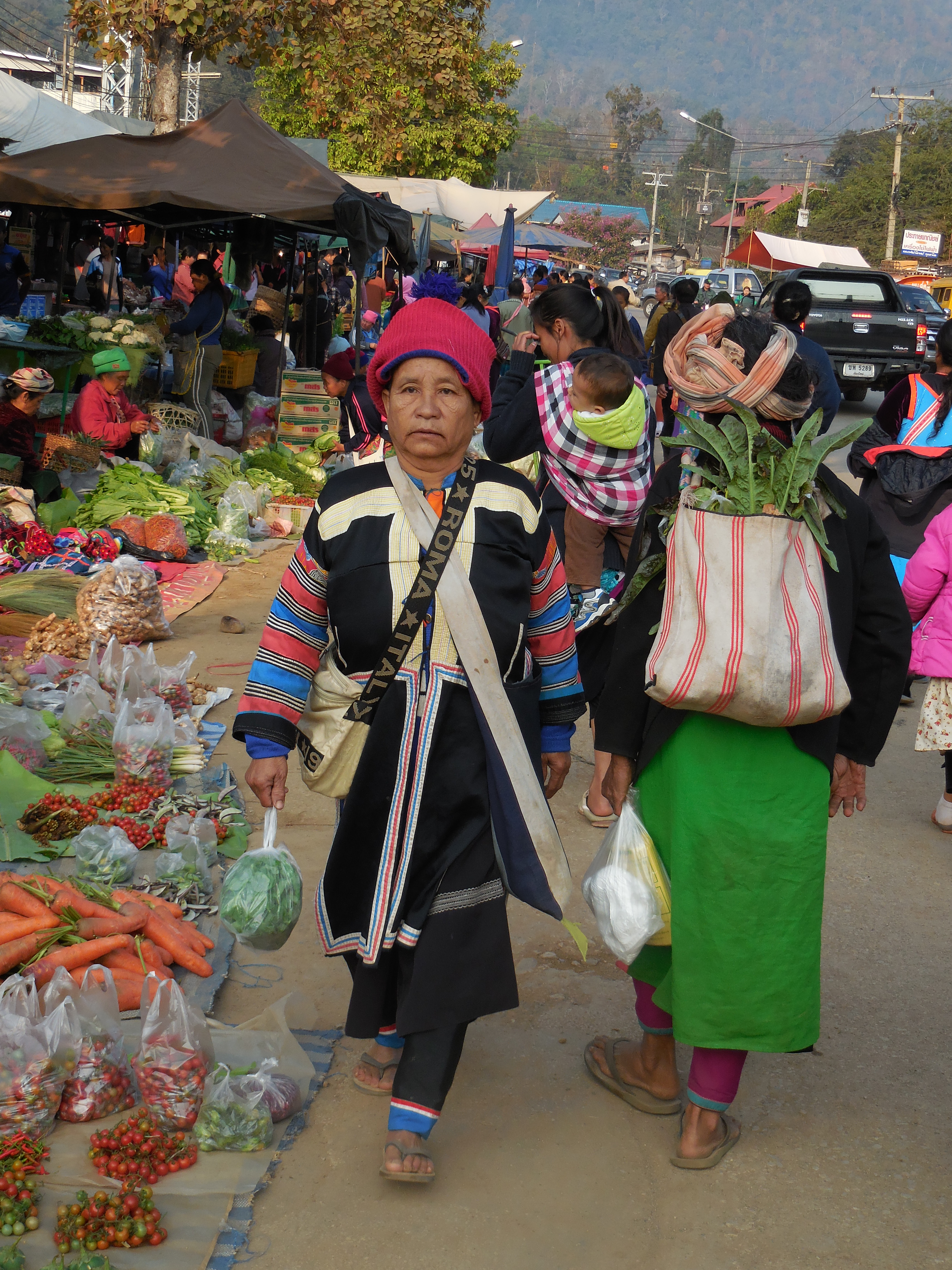 We get to the market at about 7.45. in the morning. Soppong is already packed. The wide dirt sidewalk on one side of the road is crammed with parked motorbikes and pickup trucks some still full of people and produce, some already emptied. On the other side of the street the market is already in full swing. The sellers have displayed their merchandise, and the buyers are shopping. Most of them have clearly dressed for the occasion, looking splendid in their colorful tribal costumes.