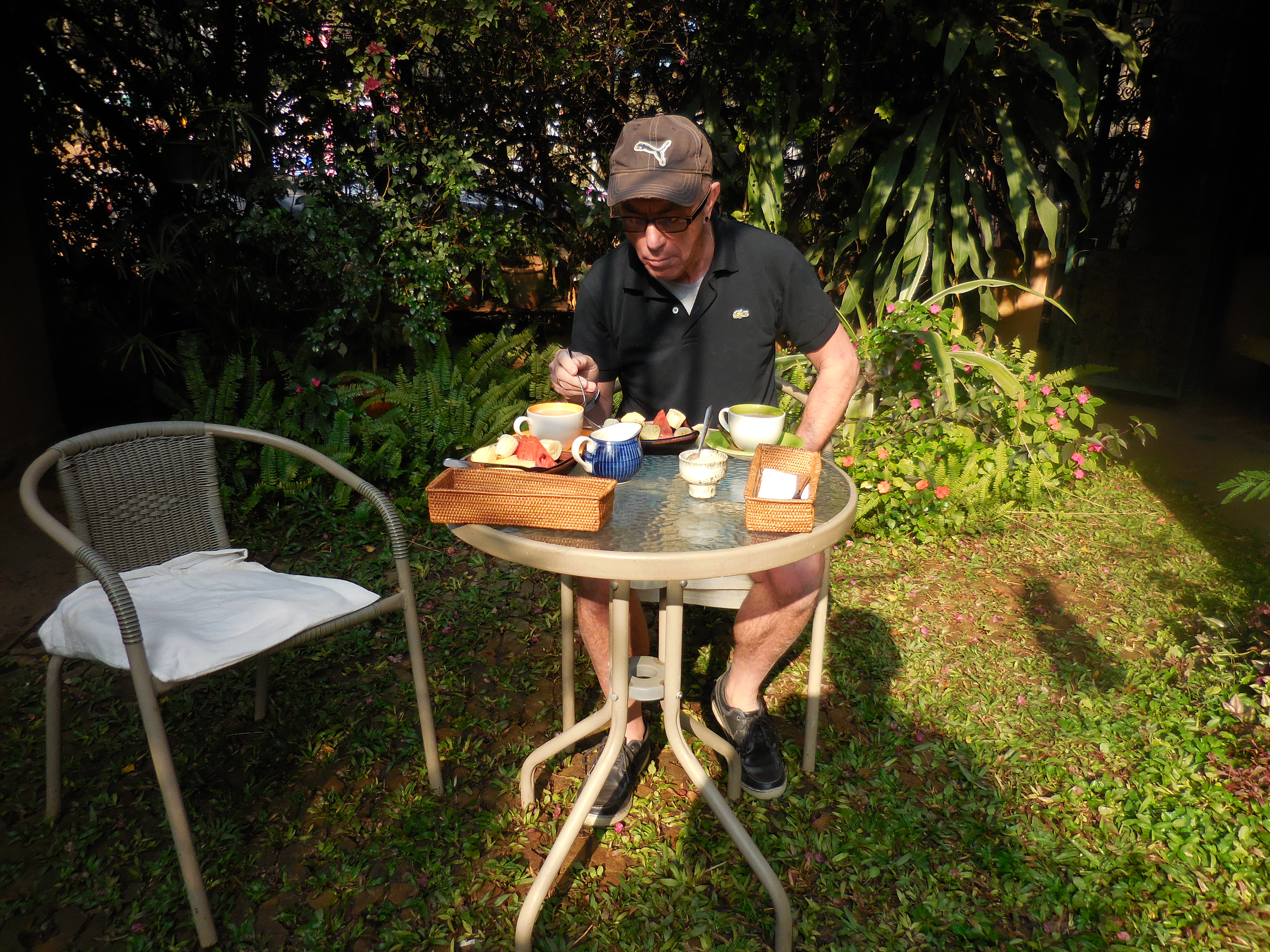 We too are having fun. The atmosphere is great and we are reluctant to leave. But we have a full day ahead of us. First we return to the River Inn for a late breakfast. This time we sit in the garden of the Seven Elephants. The furniture has changed from rustic to plastic, but the food is as good as ever