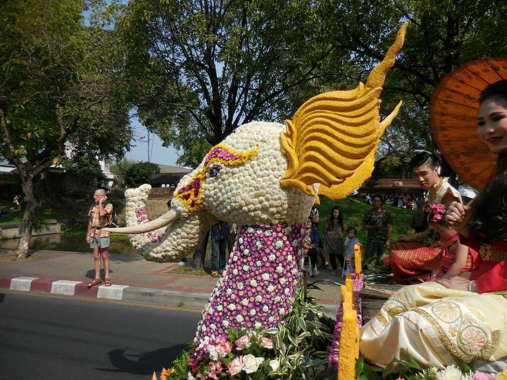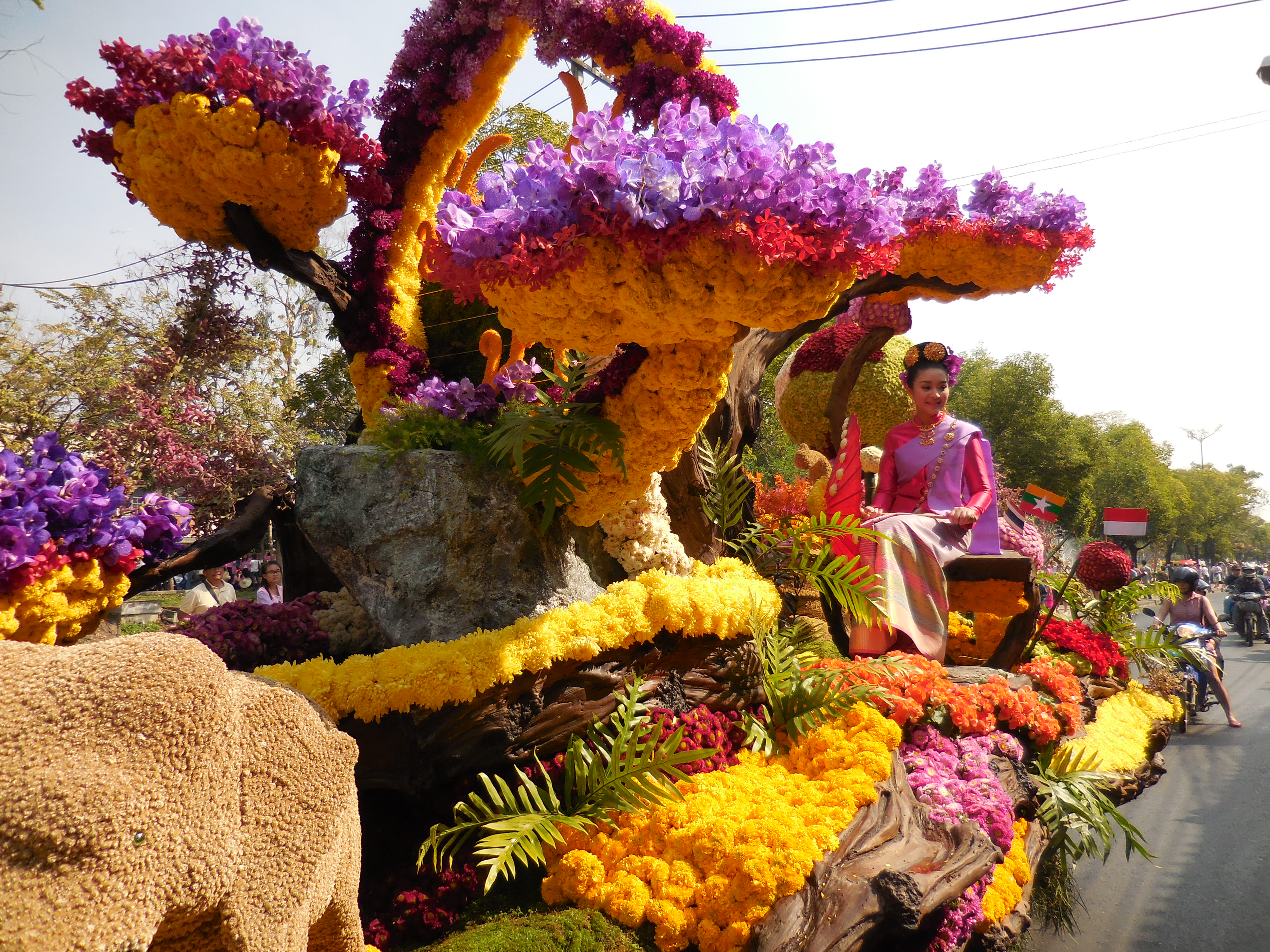 The main attraction are the floats. They are made entirely of, or are heavily decorated with flowers and are staggering in their concept, design and artistry. They always feature at least one beautiful Thai lady perched on top waving regally to the crowd.