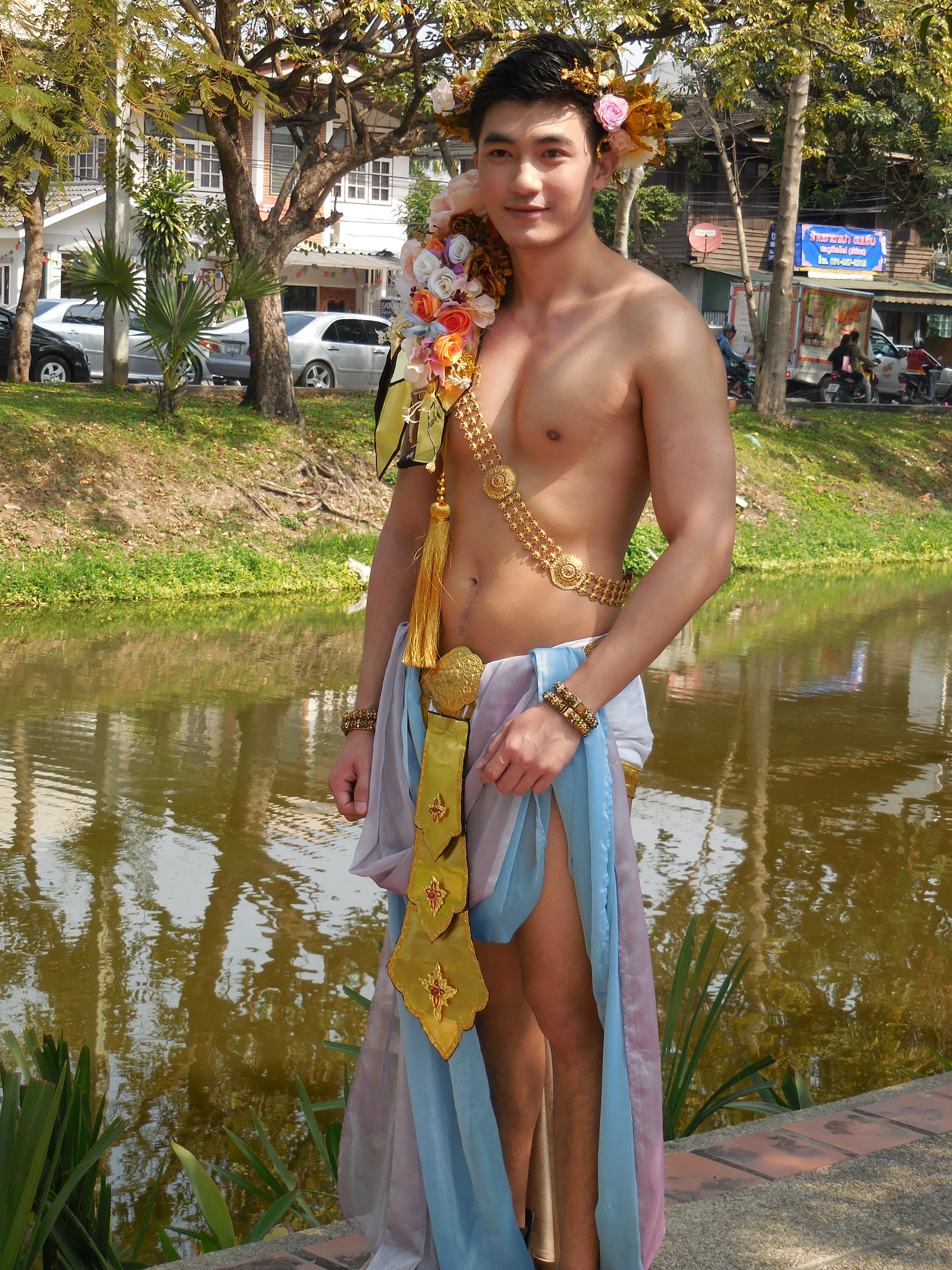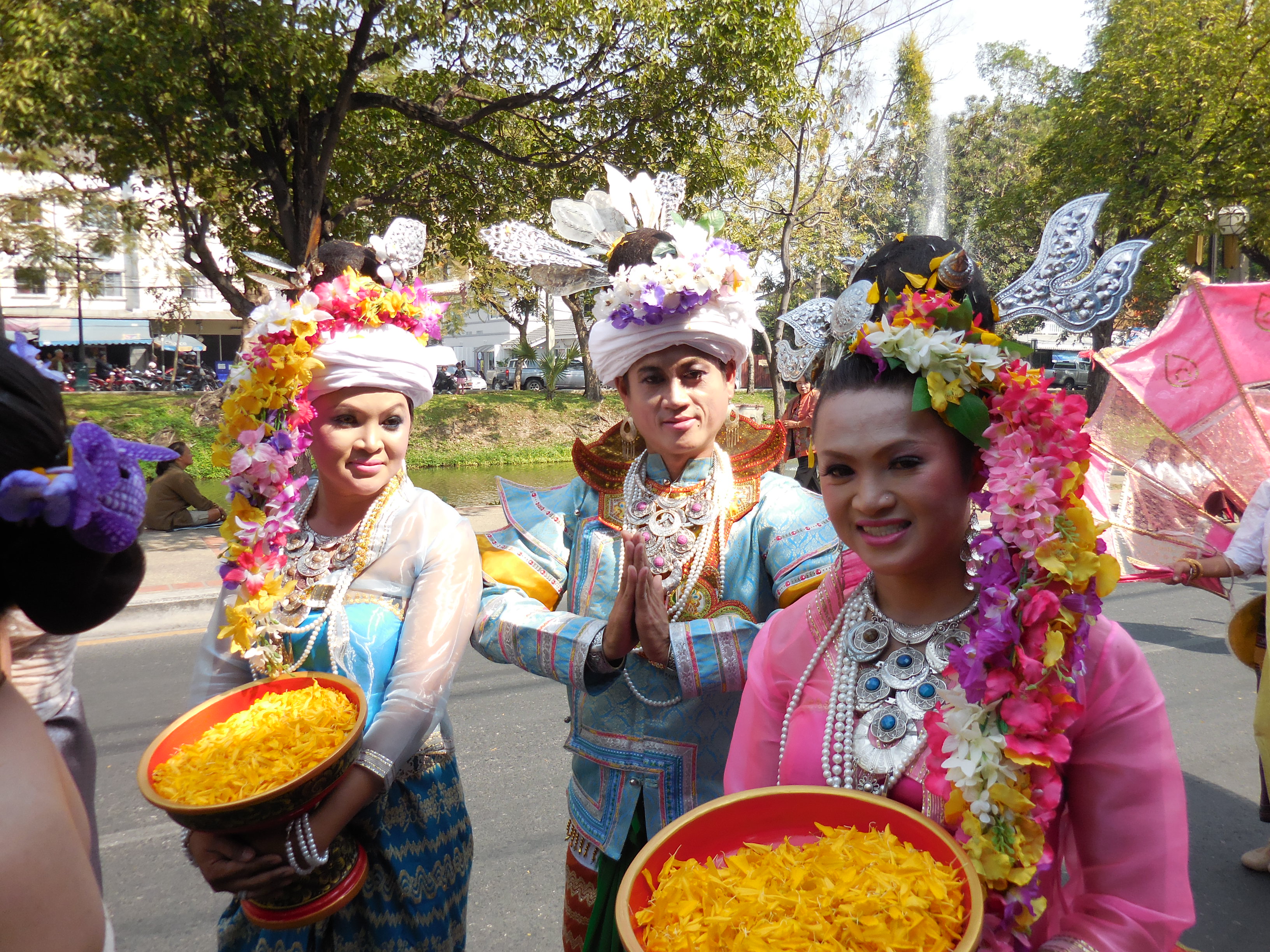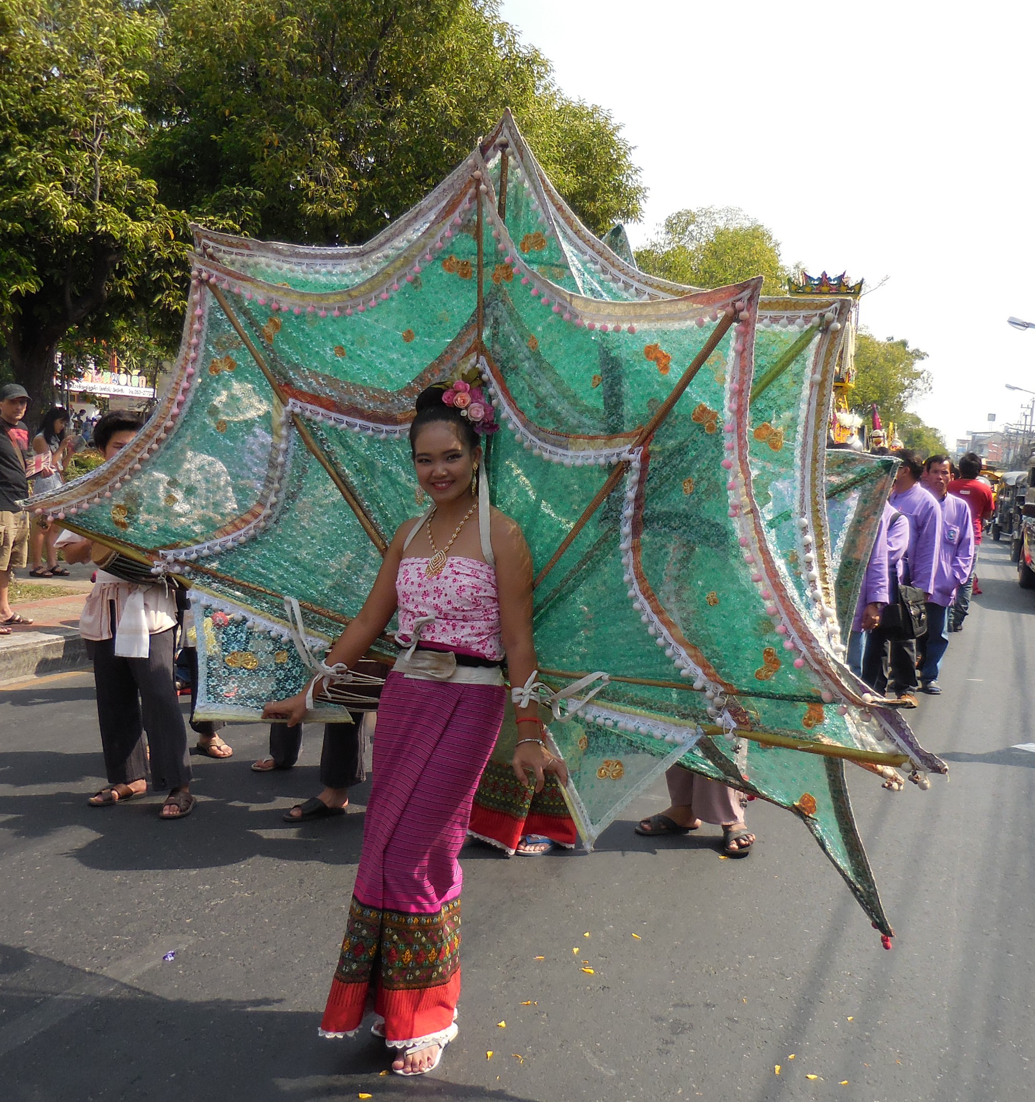 In between the floats there are groups of dancers and costumed couples featuring flowers in one way or another. The Thai girls are all extraordinarily beautiful in a delicate way:
