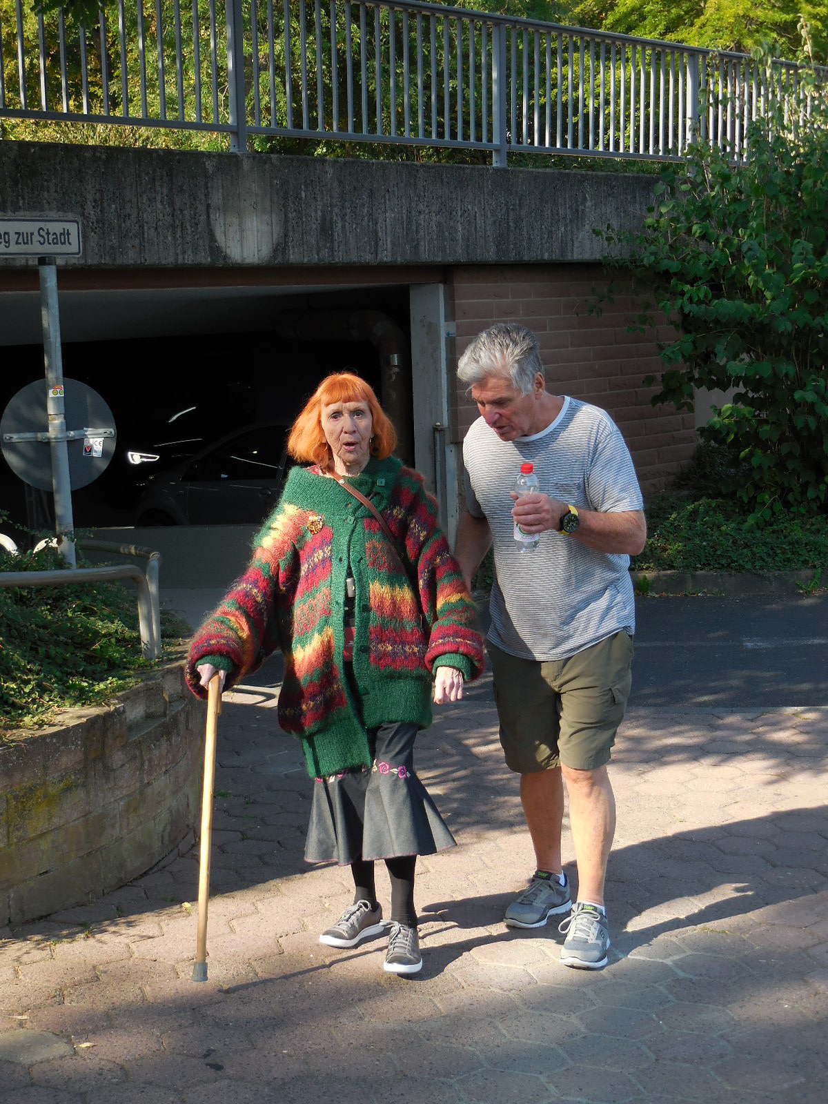 The tour is often preceded by a coach ride to the center of town, and Mary nimbly climbs the steps into the coach, shaming many who struggle aboard, hauling themselves up by the handrail. Once the walking tour begins, Mary walks slowly and carefully and takes a stick if she knows there will be cobblestones,