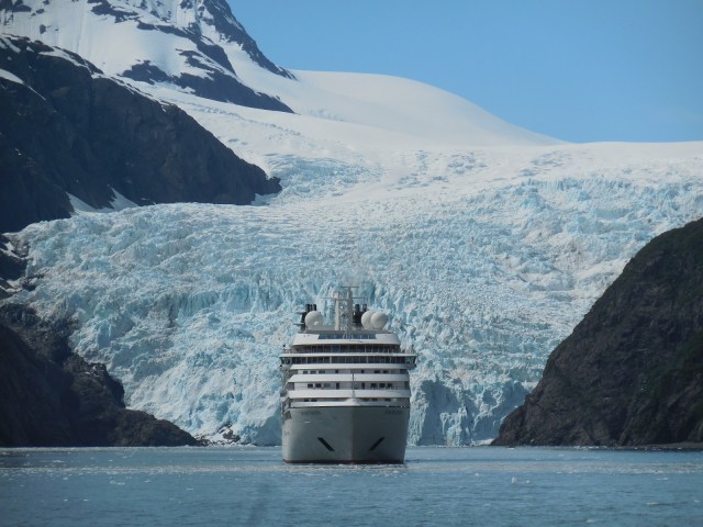 The more sensible passengers sit inside looking out. But I haven’t come all this way to experience Alaska through a picture window. I have come to have my senses awakened by all that Alaska has to offer, and as I look out on the stunning scenery I relish the fact that what Alaska is offering me is mimosas and breakfast on the deck of a luxury 6 star ship.