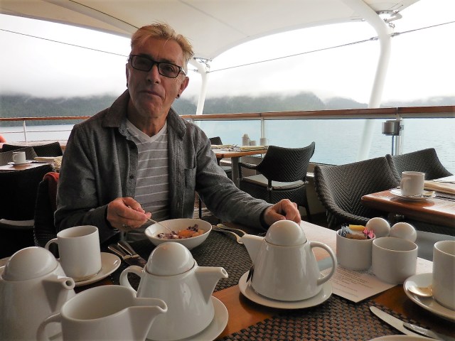 The wind is biting into any extremity that I have left uncovered. Unfortunately that is rather a large area as for some inexplicable reason I am wearing just shorts and a T shirt (well, I thought I didn’t feel the cold). There are heat lamps overhead, but the icy wind seems to whisk the heat away before it reaches us. Pots of hot tea and a gargantuan breakfast helps, as does the offer of a blanket that Seabourn thoughtfully supplies. But it is an alarming shade of orange and clashes terribly with my colour scheme this morning. A blanket is a wonderful thought, but who wants to be swaddled in bright orange at 9 a.m. – or at any time come to that.