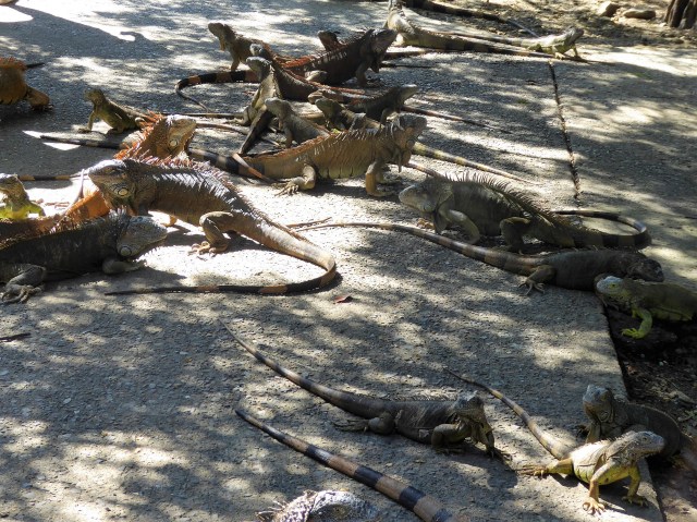 Where the potholes were so bad that traffic came to a virtual standstill, young barefoot boys walked between the cars begging for money. Finally we found an unmade road to the right with a sign to the Iguana sanctuary. Our guide book said the entrance fee was $1 which was really a donation to help with the work of looking after the iguanas. Either the guide book was out of date, or the owners of the sanctuary had failed to read the book. They demanded $10 which probably explained the lack of tourists. We were told that the fee covered the services of a guide which was mandatory. The guide, a young woman in her twenties wore a yellow T shirt with an Iguana printed on it and for some reason a pair of fluffy pink bedroom slippers. She appeared totally bored by the whole process as she  “guided” us about 100 yards down the path to an area with a large tree, and a bench soiled by the dozens of iguanas and pointed to the ground and announced