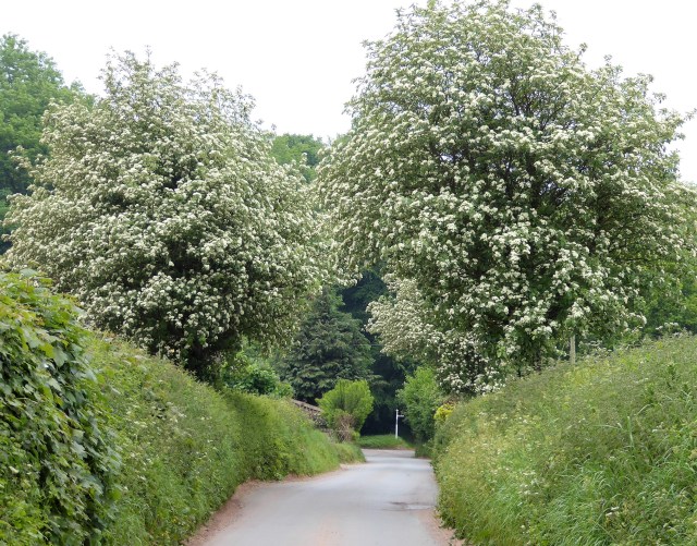 Above the hedgerows are the mayflower trees, looking spectacular in full bloom, the crowning glory of the English countryside