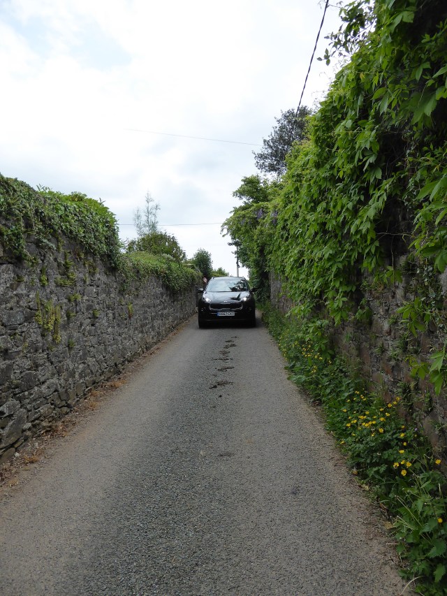 When we meet a car coming the other way, one of us has to reverse until we find a spot wide enough for two cars to squeeze by. When the lane is lined with vegetation it is not so hard, but when lined with walls it is quite a different proposition.