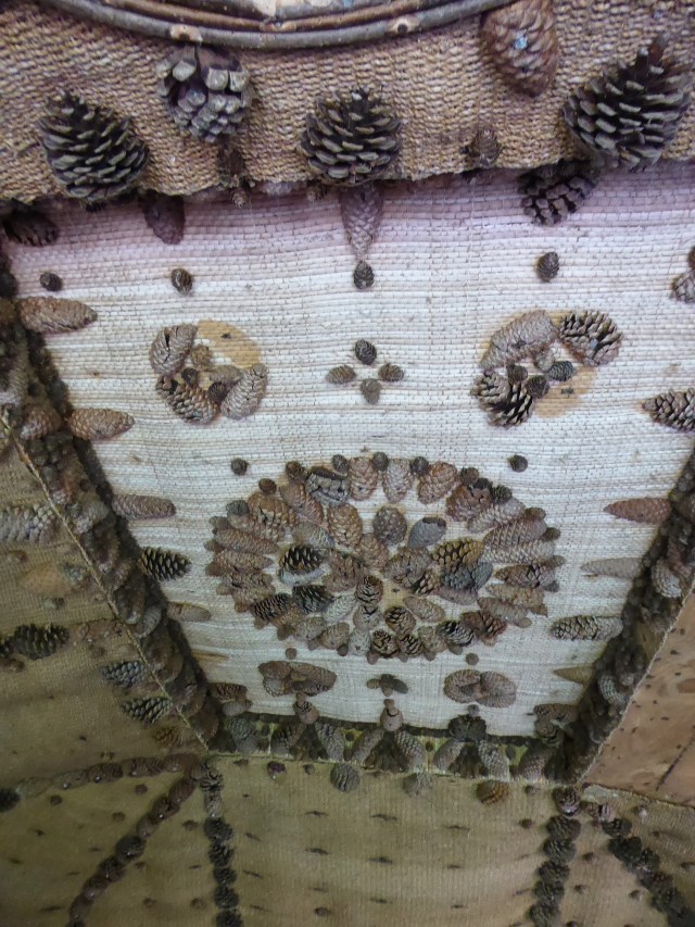 It is a rather fabulous little house with each of its three rooms lined with different materials, from various woods and deer skin, to matting and pine cones which cover one ceiling