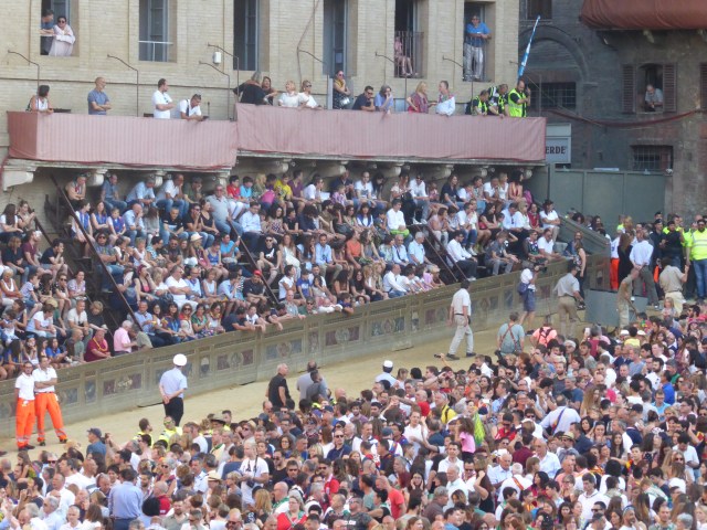 The Piazzo Del Campo has been turned into a race track. The course around the scallop shell shaped piazza is covered in a compacted yellow coloured earth, the central part left as a free place for the audience to stand.