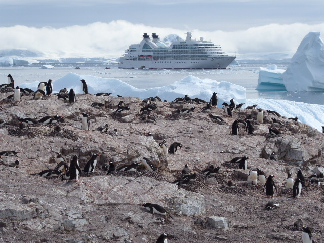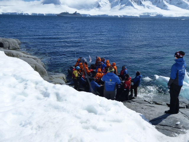 Each day starts with getting dressed. Nothing unusual in that, except now it takes about 15 minutes as I don layer after layer of clothing, starting with merino wool long johns and long sleeve T shirt, heavy weight sweat pants, sweat shirt, puffer jacket, waterproof parka, waterproof pants, two pairs of merino wool socks, insulated calf length waterproof boots, woolly hat, scarf, gloves, ski poles and finally a life jacket. And that’s before leaving the cabin. Squeezing through the door becomes quite a challenge. We struggle along the corridor getting seriously overheated and down the stairs to the small opening in the side of the ship. We clamber into a zodiac for a ride to shore, and experience cold like we have never felt before