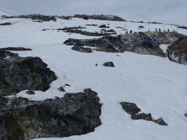 These penguins make their colonies and nest in areas where the rocks are not covered by snow (except sadly the dumb Adelies). Sometimes that can be a long way from the sea