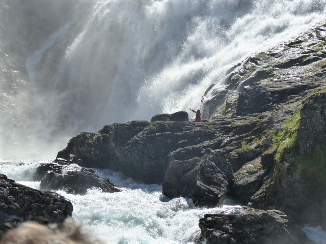 As we step out, mystical music fills the air and a dancer dressed in red flowing robes moves gracefully over the rocks while the spray from the waterfall washes down on her.