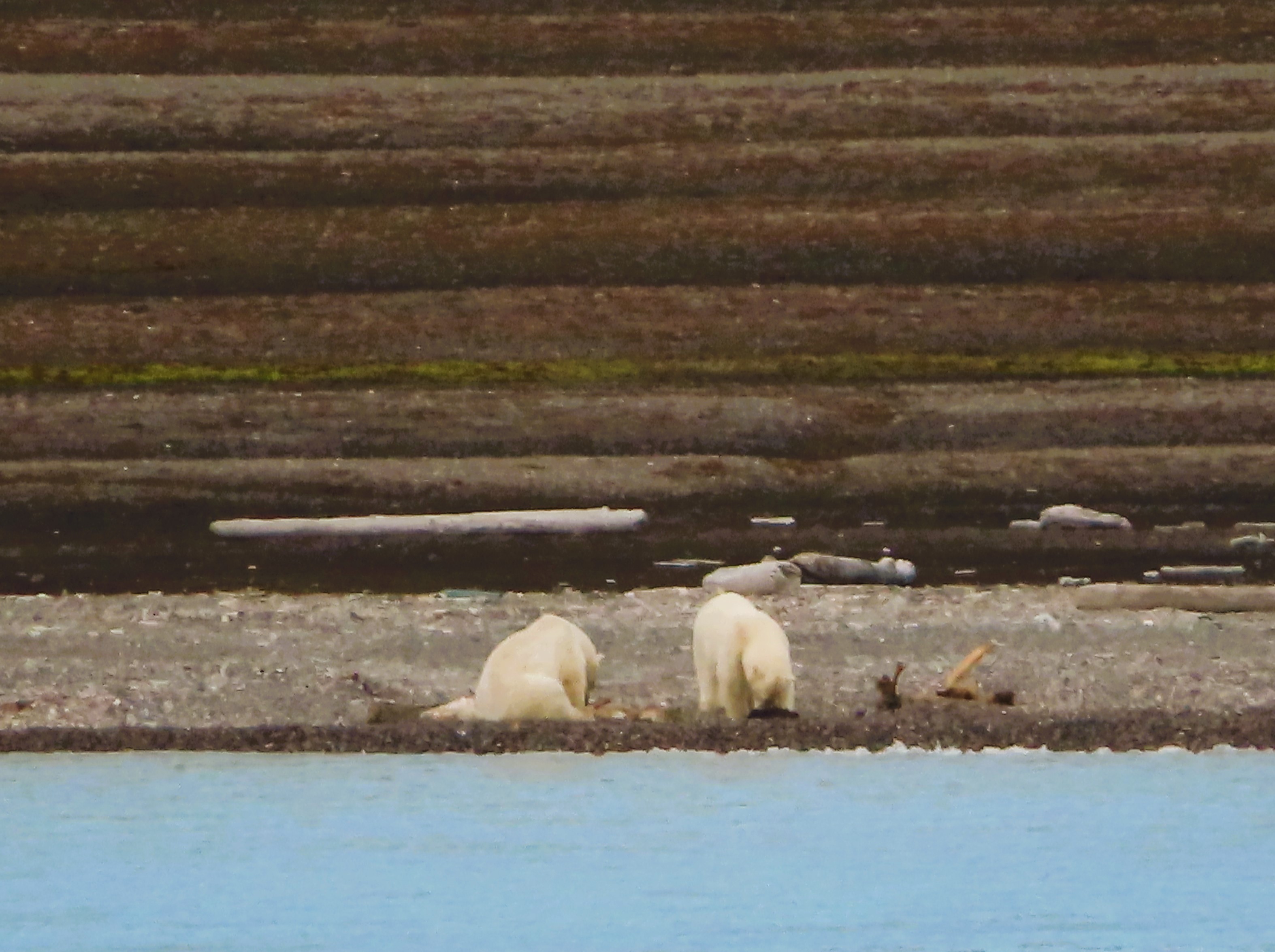 Two days later, the bell in our cabin goes off again. This time we are told that there are two bears and they are feeding on the remains of a carcass. We heave ourselves out of bed, put many more layers of clothing on and head for the deck. The bears are still a long way away, but we can spot them with the naked eye. They are intent on feeding and we watch them for some time. Many of the little men with huge cameras start showing us the amazing photos they have taken. Several of them have captured the moment when the bears appear to be kissing with their noses touching. It is a wonderful shot, the bears fill the screen and look totally adorable. The Fabulosity Meter makes enthusiastic noises. The little men puff out their chests.