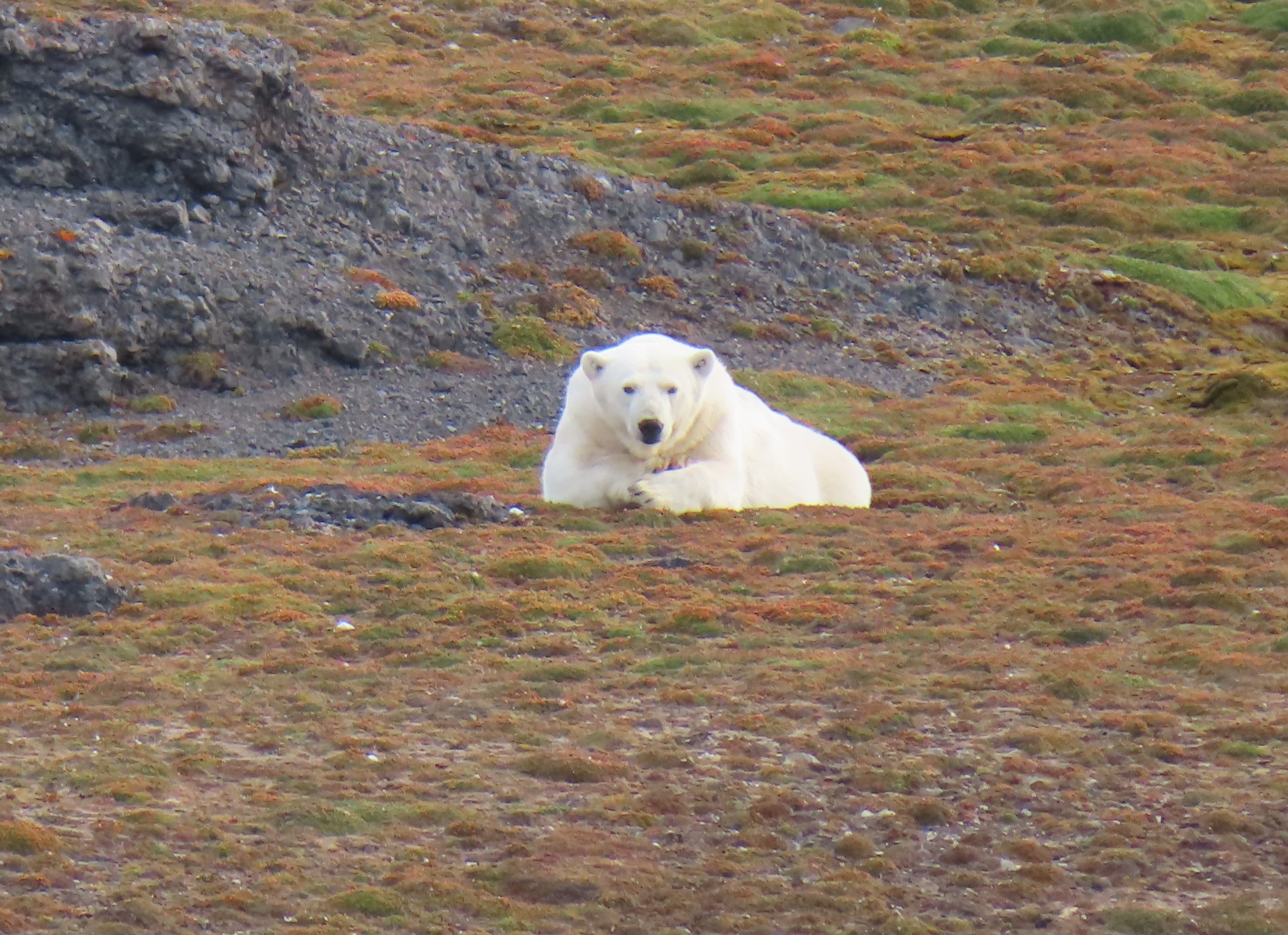 But, the message he delivers is that there is a polar bear on land and if we come up to the viewing deck we will be able to see it with the use of binoculars. We debate whether this is worth getting out of bed for, let alone going outside. Begrudgingly we decide that if this is going to be our only opportunity, we should make the effort.