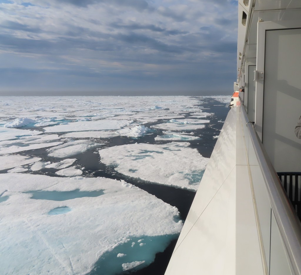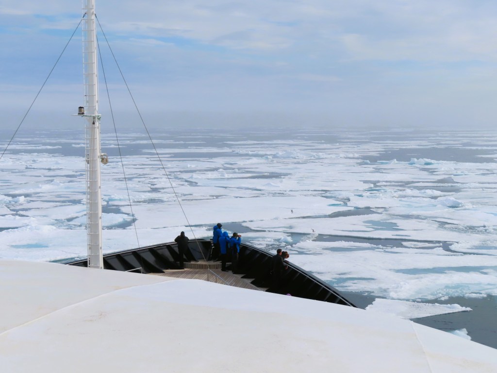 The occasional piece of ice is now passing by. Ahead there is more ice, but nothing the ship can’t handle. Streaks of white cloud cover the blue sky as if mirroring the ocean.