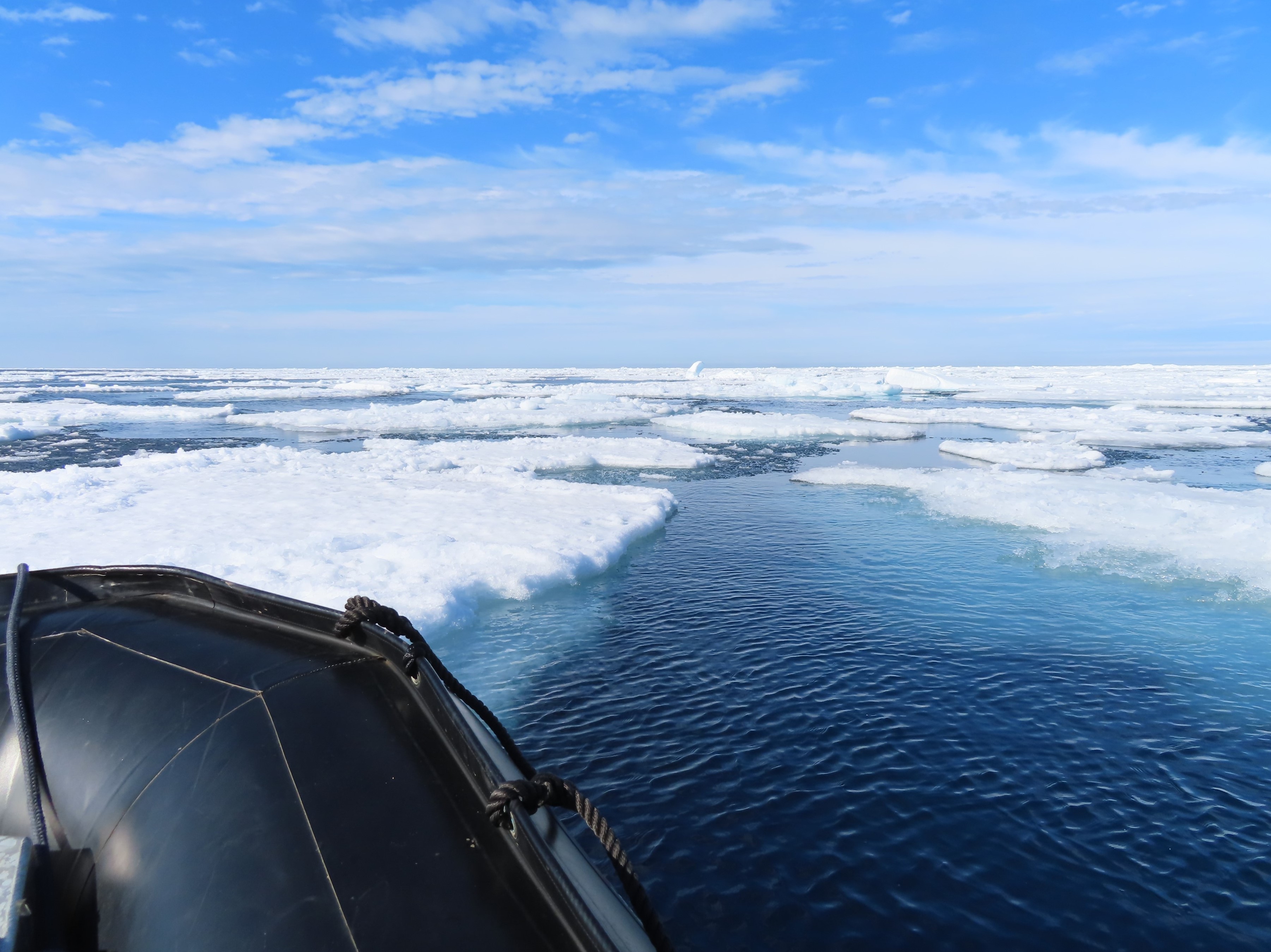 Every piece of clothing we have is wrapped around us and looking like waddling Michelin Men we awkwardly climb into the zodiac and make our way in to the Arctic ice, just inches above the freezing water