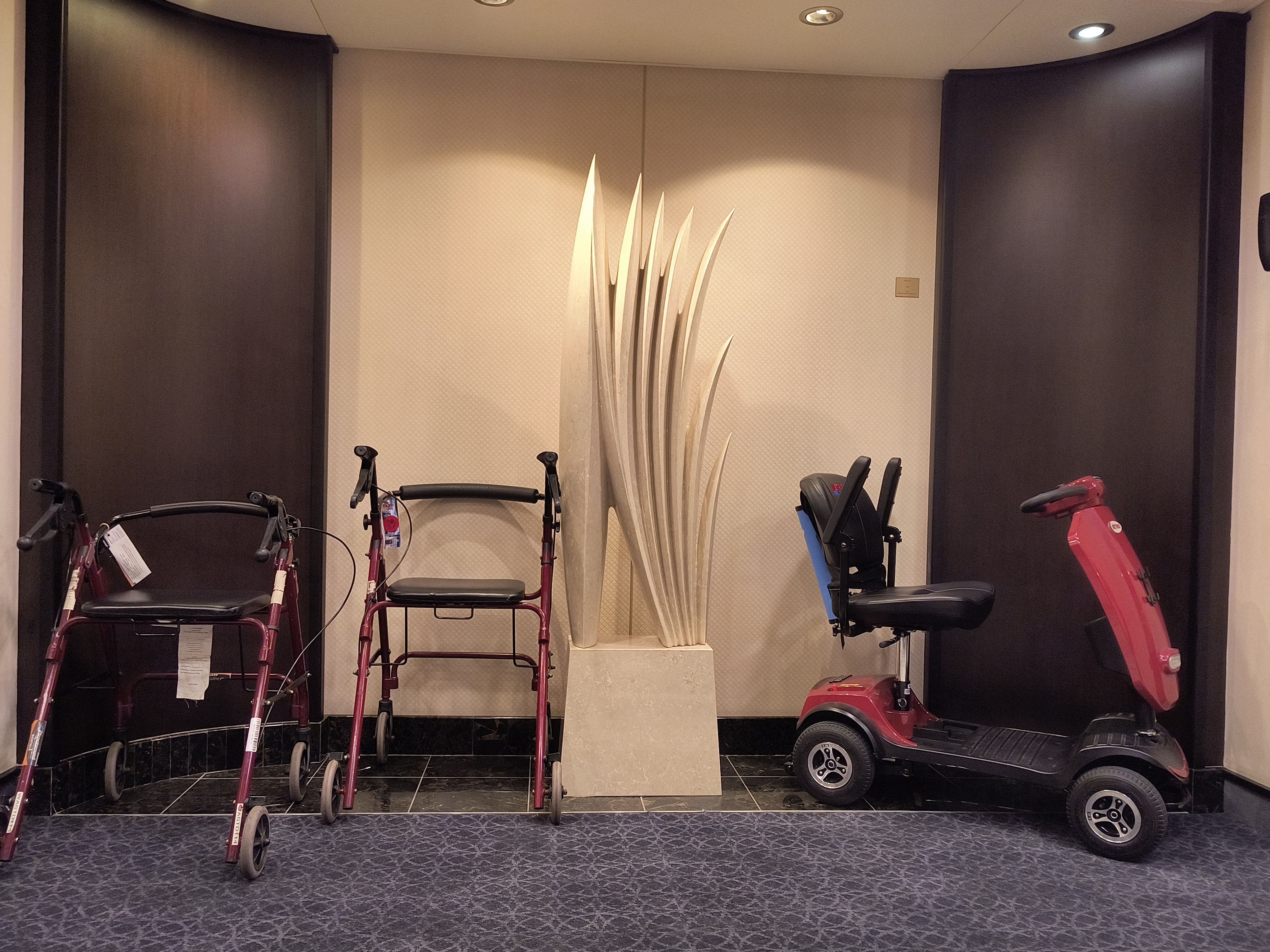 Wheel chairs of all sorts, sizes and colors are strewn along the corridors of the ship like broken down cars along a country road. Rather than take them into their cabins where they will take up space and not look very attractive, they leave them in the corridor where they do exactly the same.