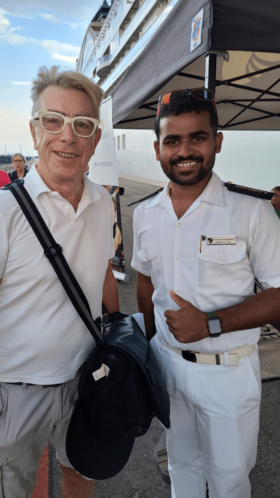 Twenty one days have gone by and it is time to leave the ship. I suddenly realise that I have been witnessing blog material every day and haven’t done anything about it. I need a photograph. As we disembark, VG actually tells Gordon how sad he is. “The ship will seem so empty without you” he says, “and I will be so lonely”. OMG! He has read way too many bodice ripping romantic novels. Perhaps he is a Barbara Cartland fan. The initials VG certainly fit.
