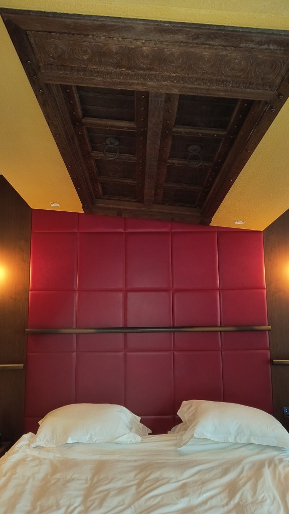 In the ceiling above the bed, at a rather strange angle, is a large pair of ornately carved wooden doors with big brass handles . It is directly above us, and it is very disconcerting.