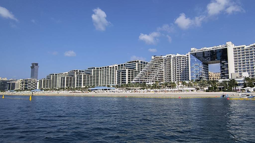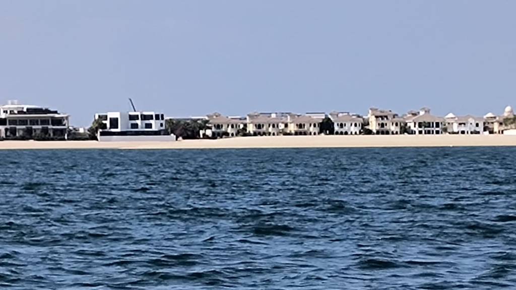 We tour the “fronds” of the Jumeirah Palm to see how the 0.01 % live. The boat is not allowed to get too close but we can see huge mansions lining the glorious man made beaches that are completely deserted. The obscenely wealthy don’t leave their homes. They live truly private lives and do not want to be seen by anyone, even if they are passing by in a speed boat a mile offshore. They never know who might be pointing a zoom lens at them. That would be me! But my cheap phone has a cheap zoom lens and is nowhere near powerful enough to take a good shot: