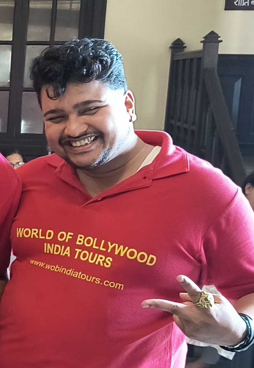 Now he has the exuberance we were hoping for. Actually his exuberance is more like flamboyance, He is young and very overweight. His red Bollywood Tour T shirt fits him like a glove, which is a polite way of saying it is way too tight. Every curve, every roll of his body is highlighted. He has a pile of carefully groomed jet black hair on top of his head, an enormous and rather ugly ring on his finger and a large gold earring studded with jewels in his ear. When the sun catches the earring it dazzles, which I am sure is the point. But best of all is his huge enchanting smile. He comes rushing over to us, arms outstretched in greeting and crushes us to his voluptuous body. He is a star! Or at least he thinks he is. It is love at first sight.
