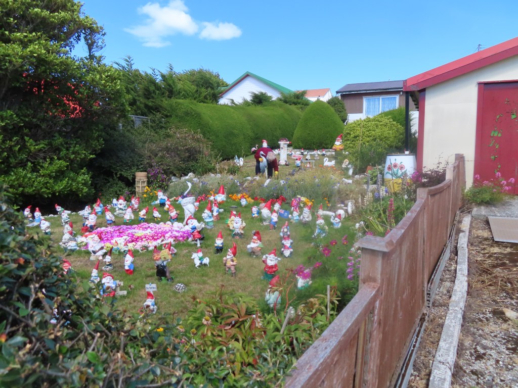 So people rarely leave town. And what they do in Port Stanley? Being English, gardening is one choice. However the weather doesn’t allow for the typical English garden with carefully trimmed lawns and well tended flower beds. Undeterred, the Falklanders find other ways to bring colour to their back garden.